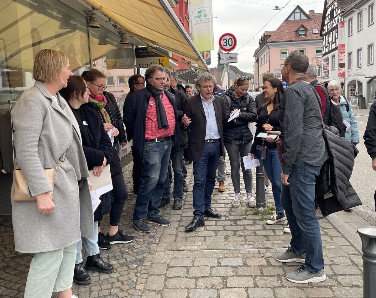 In diesem Rahmen trafen sich Gemeinderäte und Verwaltungsmitarbeiter*innen mit Vertreter*innen von Werbegemeinschaft, dem Stadtseniorenrat und dem Beirat für Menschen mit Behinderung unter der Führung von IHK-Innenstadtberater Thomas Kaiser. Gemeinsam machten sie sich zu einem „Stadtspaziergang“ auf und nahm die Innenstadt aus diversen Perspektiven unter die Lupe. Um sich besser in die Lage anderer Gruppen versetzen zu können, wurden Rollen zugeteilt und so war man als Mutter mit Kinderwagen, Senior mit Rollator, Tourist oder Einwohner unterwegs.