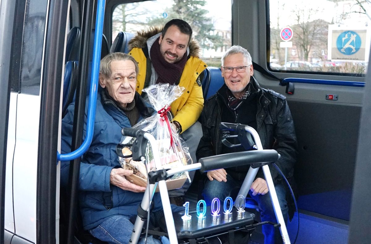 Stefan Maier ist der zehntausendste Fahrgast im Bürgerbus. V.r.n.l.: Stefan Maier, Sören Radigk, Michael Göb