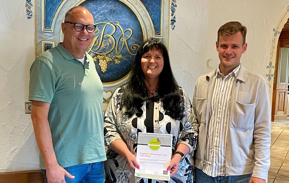 Im Hotel Suggenbad fand die Überreichung an Gastgeber Andrea Etgeton und Gerhard Ziegler-Etgeton (Mitt) durch Claudia Robinson (Tourist Information Waldkirch) und Julius Müller (ZweiTälerLand) statt.