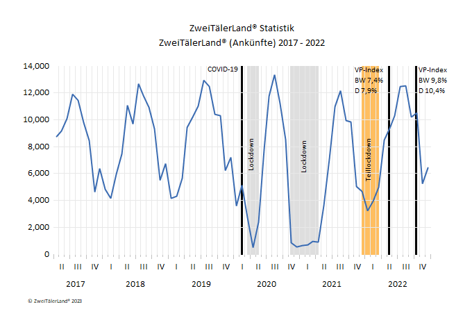 Ein tieferer Blick in die Zahlen zeigt, dass die im ersten Quartal 2022 noch einwirkenden Pandemieeinschränkungen statistisch einen stärkeren Einfluss auf die Übernachtungszahlen hatten, als die ab Frühjahr stetig steigenden Inflationsraten. Ein nachhaltiger negativer Einfluss der Inflation auf die Übernachtungszahlen ist statistisch für das ZweiTälerLand® nicht ermittelbar. Außerdem erfreulich ist, dass 2022 die Aufenthaltsdauer der Gäste im ZweiTälerLand® mit 3,8 Tagen über den Vor-Corona-Werten der Ferienregion sowie deutlich über dem Landes- und Bundesdurchschnitt von 2,6 bzw. 2,77 Tagen liegt.