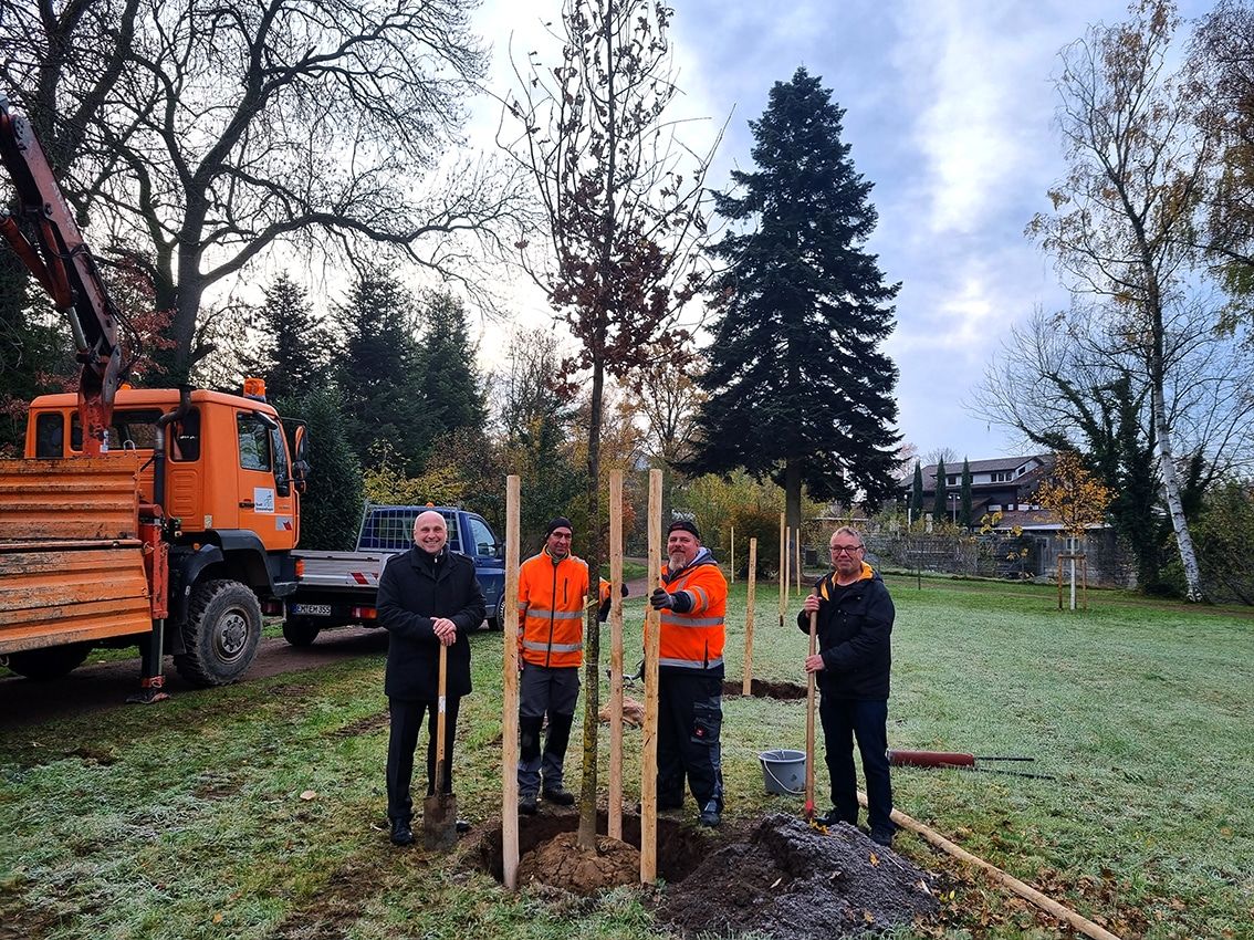 Oberbürgermeister Stefan Schlatterer und Mitarbeitende des Betriebshofs bei den Pflanzungen der Stadtbäume im Vollrath’schen Park im November 2021