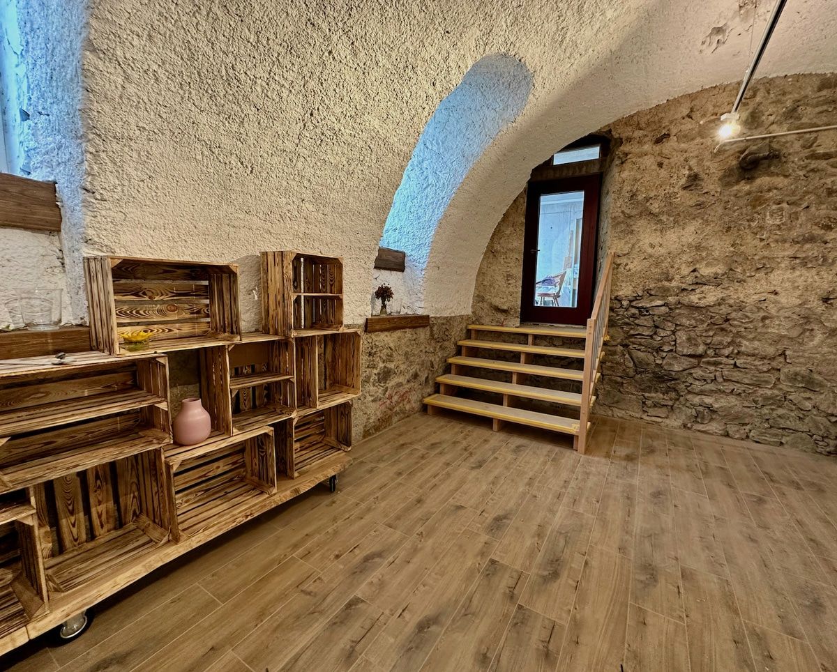Die beiden Zwei-Zimmer-Wohnungen im Erdgeschoss des Gebäudes lassen sich über den kleinen Treppenaufgang an der Schauseite des Gebäudes erreichen, die übrigen Wohnungen über einen an der Rückseite des Gebäudes errichteten Treppenturm aus Stahl. Dieser steht auf einem separaten Kelleranbau, in dem sich die moderne Pelletheizung des Alt-Vogtshofs befindet. Denn im historischen Gewölbekeller, in dem früher die Schnaps- und Weinvorräte lagerten, eröffnet in Kürze das Ehepaar Ines und Ingo Zschau einen Dorfladen mit Café. Damit mehr Tageslicht in die Räumlichkeiten hineinfällt, wurden in die meterdicken Bruchsteinwände zwei Fenster sowie ein zweiter Ausgang geschlagen. Im hinteren Teil des Untergeschosses befinden sich Toiletten, eine moderne Küche sowie Lagerräume für den Dorfladen.