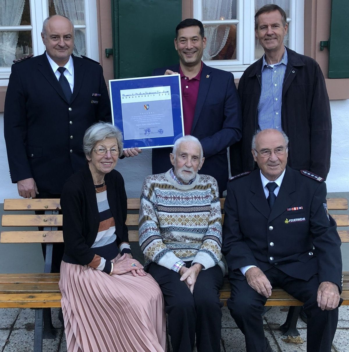 Foto v.l.n.r. oben: Kommandant Martin Schlegel, Bürgermeister Markus Hollemann, Vorsitzender des Schwarzwaldvereins Ortsgruppe Denzlingen e.V. Klaus Holz, unten: Laudatorin Barbara Hofmann, Bürgerpreisträger Hans Bross, Ehrenkommandant Edgar Ulmer