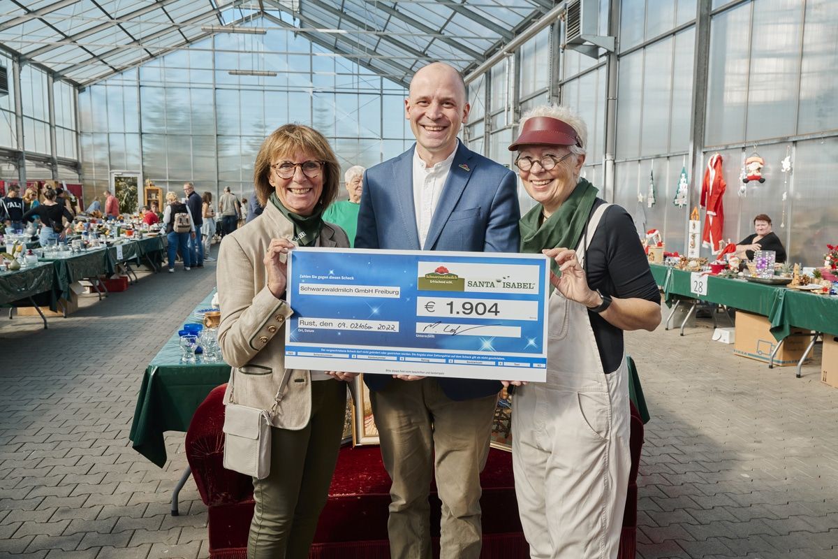 Die Besucher konnten sogar ausgefallenen Schmuck und hochwertiges Porzellan erstehen, sensationelle Preise bei der Tombola gewinnen oder einfach nur einen schönen Nachmittag bei feinem Essen in der Sonne mit musikalischer Unterhaltung genießen. Ein besonderer Dank gilt den vielen ehrenamtlichen Helfern, Spendern und Sponsoren, durch deren Unterstützung die Veranstaltung ermöglicht wurde. Zudem wurde am Sonntag das XXL-Trikot des SC Freiburg, das bei der Eröffnungsshow des Europa-Park Stadions zum Einsatz kam, an den Kooperationspartner Schwarzwaldmilch übergeben. Im Gegenzug hat Schwarzwaldmilch die Spendensumme von 1.904 Euro, dies entspricht dem Gründungsjahr des SC Freiburg, an den Verein „Santa Isabel e.V.“ gespendet. Der Erlös des gesamten Flohmarktes kommt durch den Förderverein zu 100 Prozent Kindern und Familien zugute, die unverschuldet in eine schwierige Lebenssituation geraten sind.