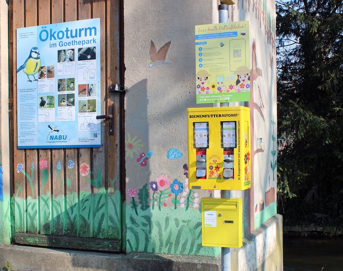 Nun gehören auch zum Emmendinger Stadtbild zwei der leuchtend gelben Bienenfutterautomaten: Im Goethe-Park am Ökoturm und am Stadtteil- und Familienzentrum Bürkle-Bleiche. Ab sofort können dort Samenkapseln für insektenfreundliche Pflanzen gezogen werden. Ziel der Aktion ist es, mehr Blütenvielfalt für heimische Bestäuber-Insekten zu erzeugen.