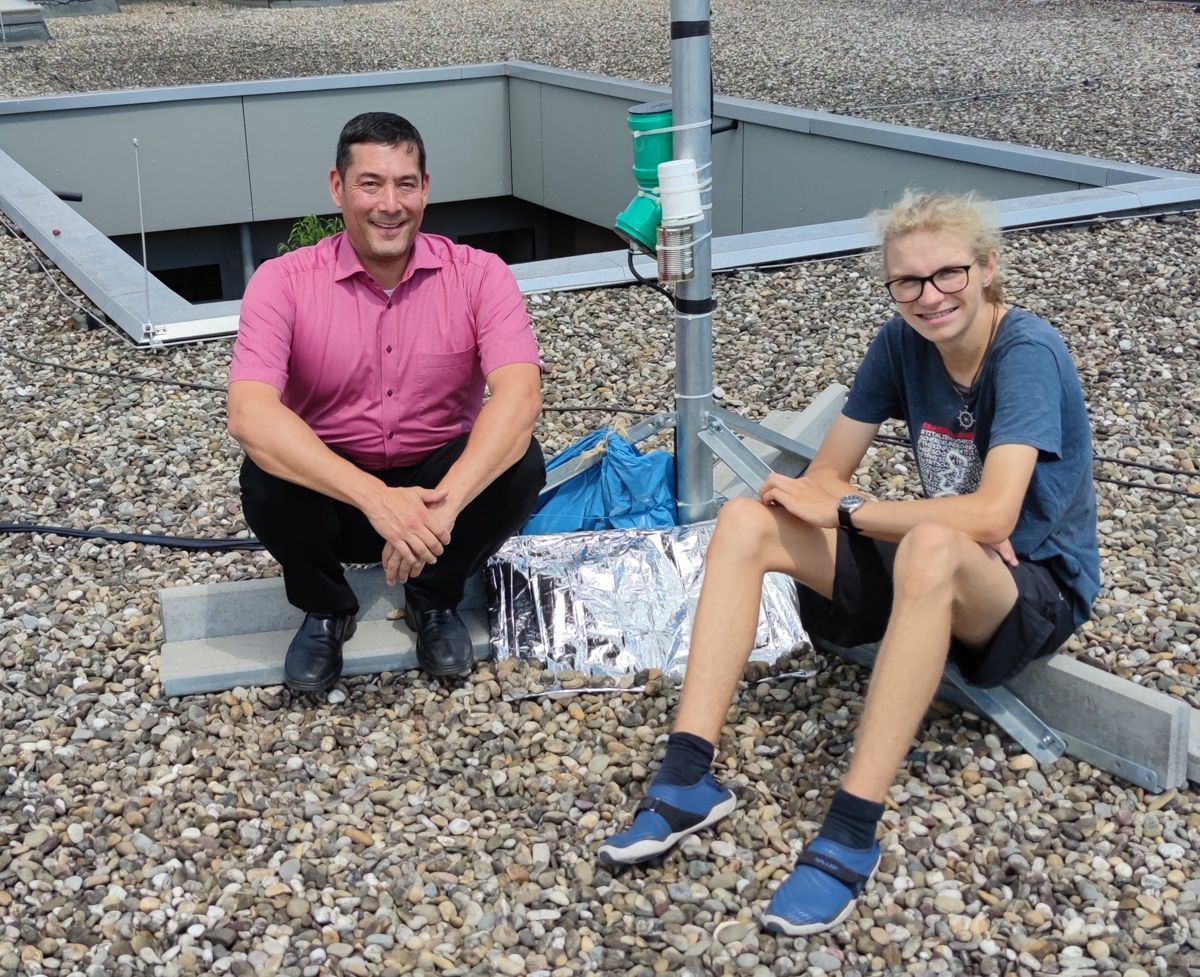 Bürgermeister Markus Hollemann und Aaron Höldin bei der Besichtigung der Wetterstation auf dem Dach des Bildungszentrums; Gemeinde Denzlingen