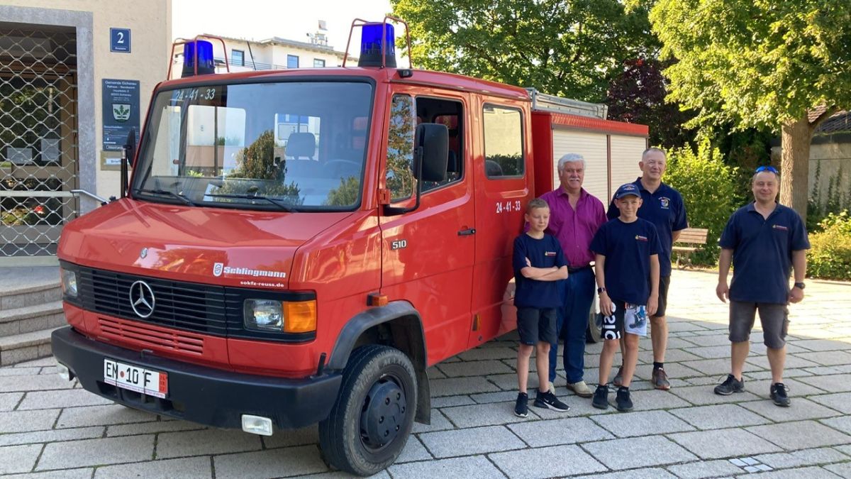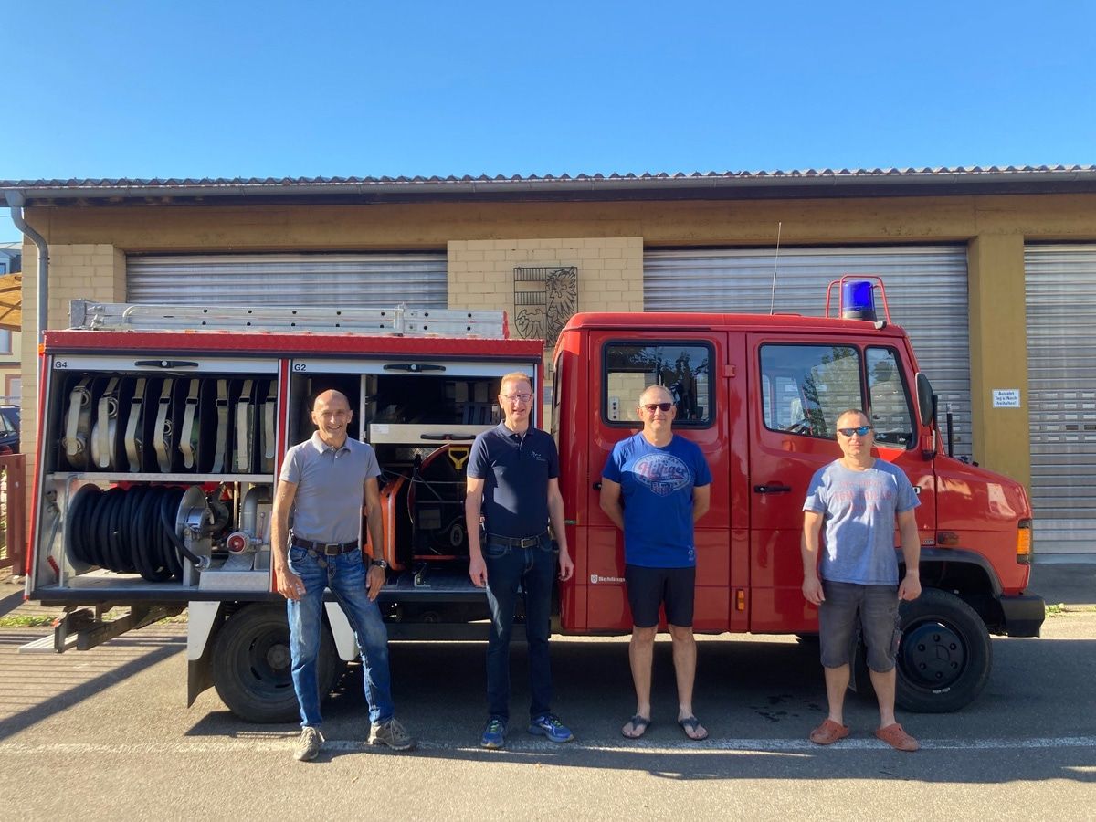 Übergabe des Feuerwehrautos an Sepp Spieß, den zweiten Bürgermeister der Stadt Eichenau (links), durch Mitglieder der Feuerwehr Herbolzheim.