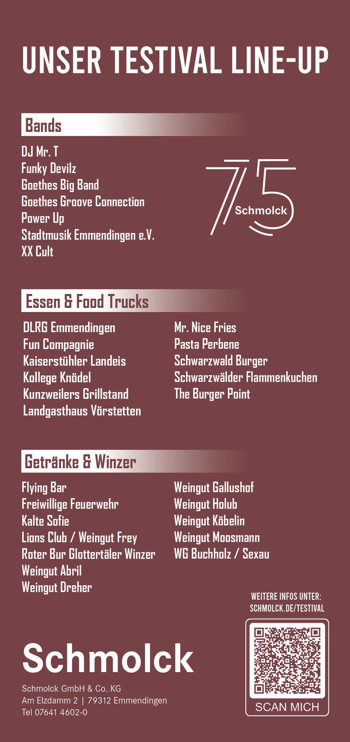 Das Autohaus Schmolck feiert sein 75.-jähriges Bestehen und lädt am 9.07.2022 zum großen Food & Wine Testival auf ihrem Gelände am Elzdamm in Emmendingen ein. In einem einzigartigen Ambiente auf dem Außen Gelände des Autohaus Schmolck heißt es von 11 -24 Uhr entspannt genießen.