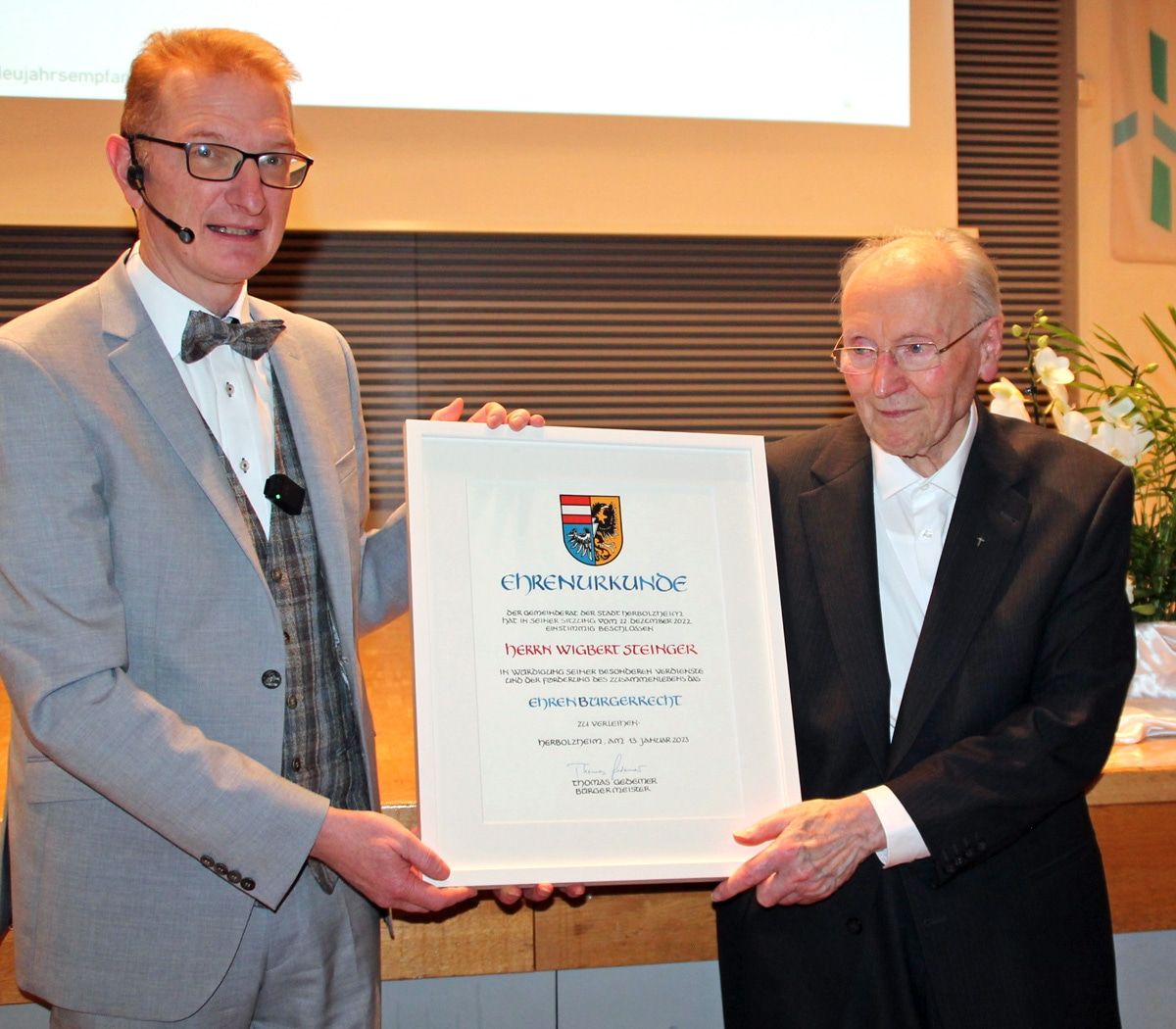 Die besondere Verleihung des Ehrenbürgerrechts ging beim Neujahrsempfang an Wigbert Steinger.