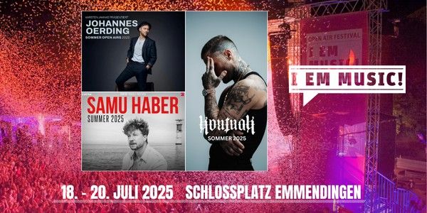 Drei Tage, drei Konzerte und unendlich viele Gänsehautmomente: Vom 18. bis 20. Juli heißt es wieder I EM MUSIC auf dem wunderschönen Schlossplatz in Emmendingen! Das beliebte Open-Air-Festival bringt echtes Sommerfeeling mit großen Namen, einer unvergleichlichen Kulisse und der besonderen Magie in die Region.