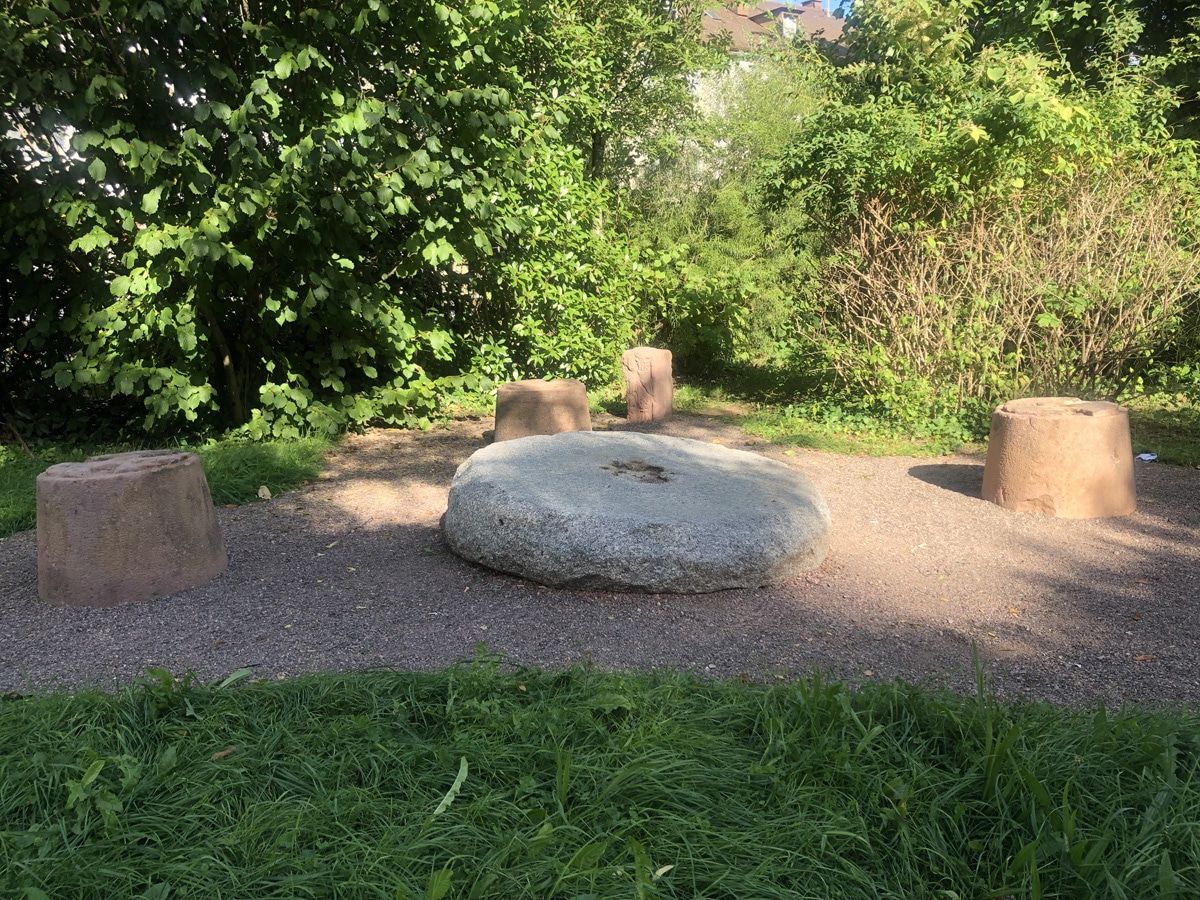 Erhaltene Steine aus der ehemaligen Vollrathschen Mühle, nähere Informationen unter dem QR-Code auf der benachbarten Infotafel „Oskars Wasserrad