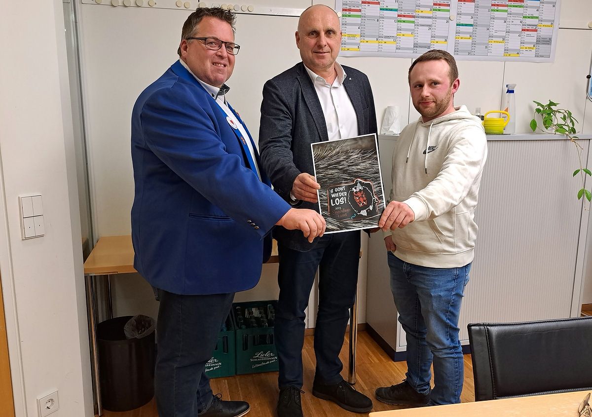Von links nach rechts Narrenmeister Alexander Maier,OB Stefan Schlatterer, Umzugsleiter und Vorstand der Ämädinger Fellteyfel Danny Lipp