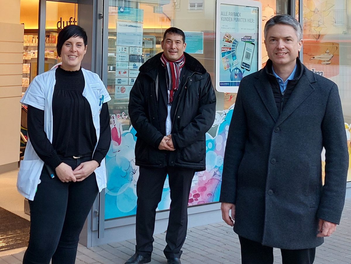 Heike Stratz, Filialleiterin dm-Markt, Bürgermeister Markus Hollemann, stellvertretender Bürgermeister Thomas Pantel