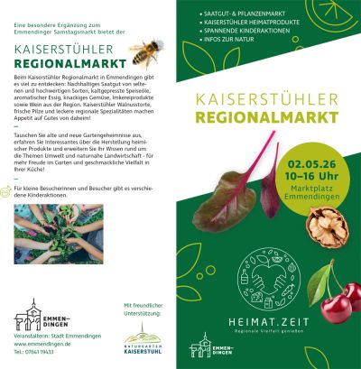 Nach dem Erfolg der vergangenen Jahre kehrt der Kaiserstühler Regionalmarkt am Samstag, 2. Mai, auf den Emmendinger Marktplatz zurück. Von 10 bis 16 Uhr präsentieren 15 Anbieter an 14 Ständen regionale Produkte und informieren über nachhaltige Landwirtschaft und bewussten Konsum. Das Motto lautet erneut: „HEIMAT.ZEIT – Regionale Vielfalt genießen“.