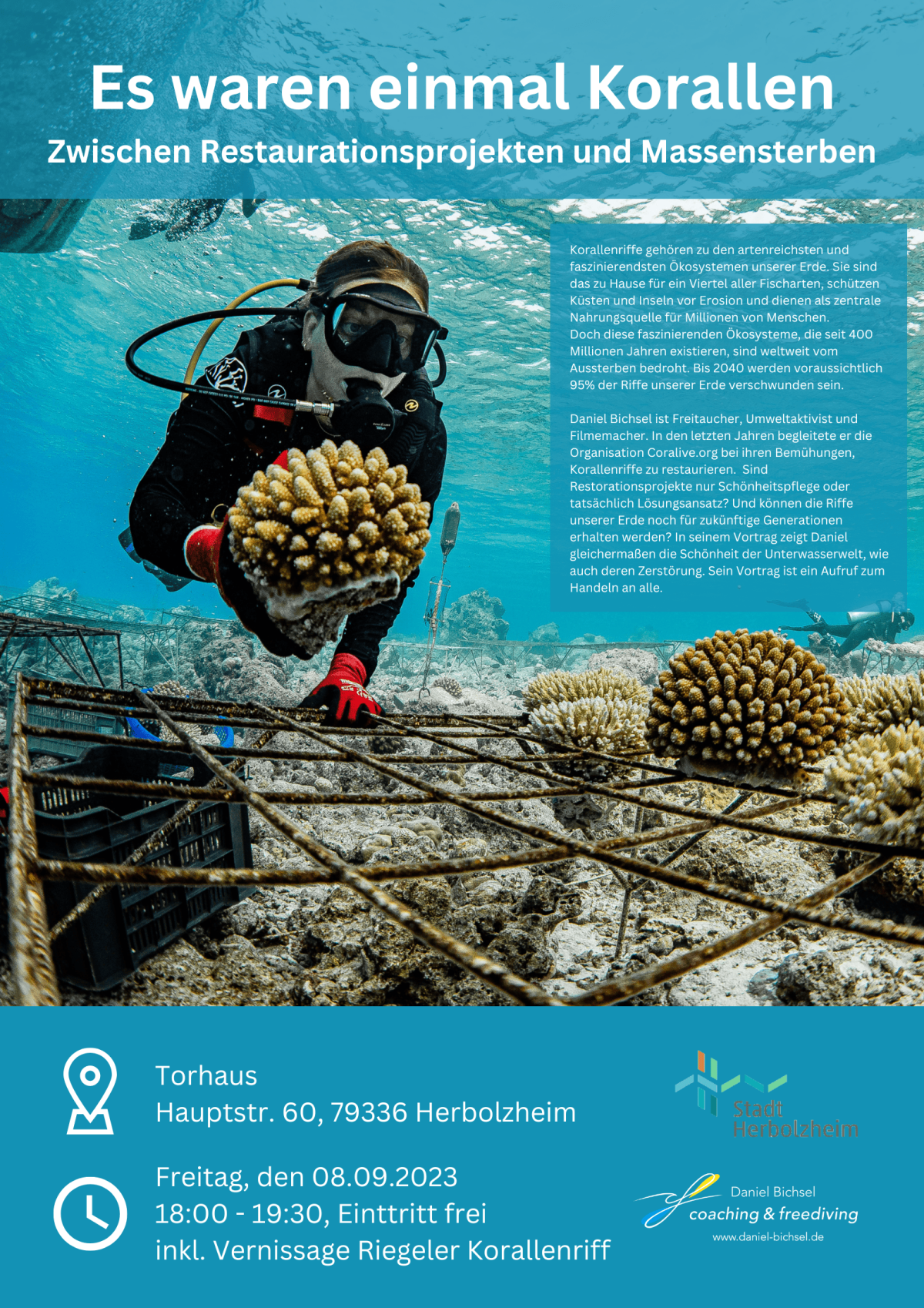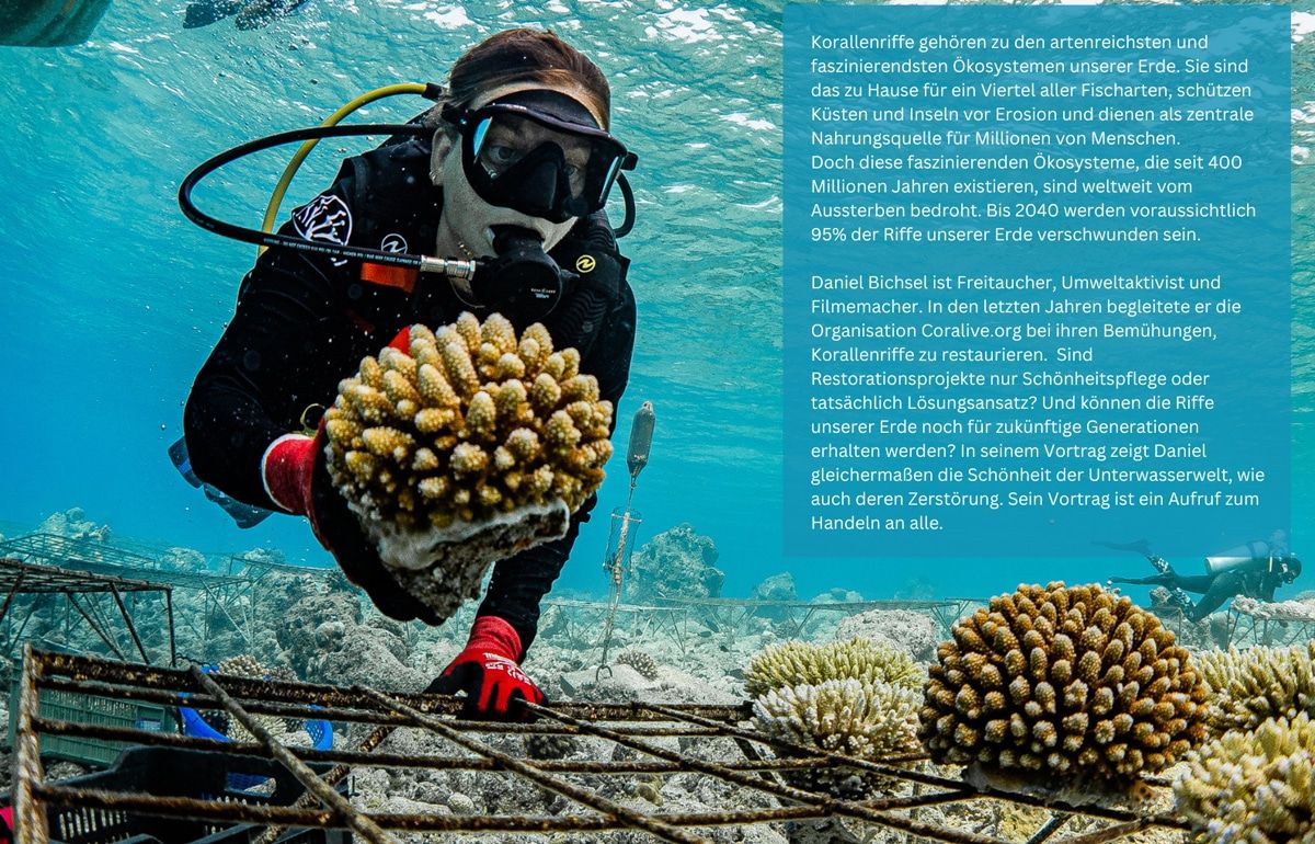 Initiatorin Anna Busch gründete in Riegel gemeinsam mit engagierten Häkelbegeisterten eine Korallen-Häkel-Initiative im Bürgercafé. Mit der Ausstellung rund um das Thema Korallensterben wird die Verbindung zwischen Klimawandel, Meeresverschmutzung und der Verantwortung im lokalen Umfeld mittels Informationstafeln und der gehäkelten Korallen aufgezeigt. Seit der Erstausstellung des Korallenriffs sind das Werk und die Ausstellung auf Wanderschaft gegangen. Mit dem Vortrag am Freitagabend wird das Korallenriff durch fachliche Expertise eines Meeresbiologen zusätzlich begleitet werden.