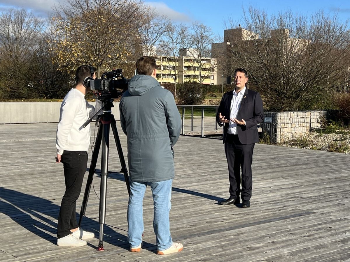 Für einen Beitrag zum Thema Klimaneutralität in Städten und Kommunen interviewte Redakteur Arno Lucaßen in Begleitung des Kameramanns Jesse Meyer Bürgermeister Markus Hollemann sowie Klimaschutzmanagerin Diana Sträuber und ihr Team. Auch im Klimaschutz engagierte Bürgerinnen und Bürger wurden vor der Kamera befragt.