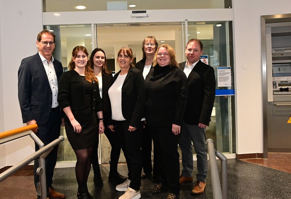 Das Volksbank-Team freut sich über die Wiedereröffnung des modernisierten BeratungsCenters Teningen. Bild v.l.n.r.: Bernd Kern, Leiter Privatkundenmarkt, Linda Ruf, Arbnesha Jusaj, Manuela Hotz, Heidi Schumacher, Tatjana Ippolito und Michael Schindler (nicht auf dem Bild: Claudia Momberg, Silvia Grathwol und Hakan Kaya)
