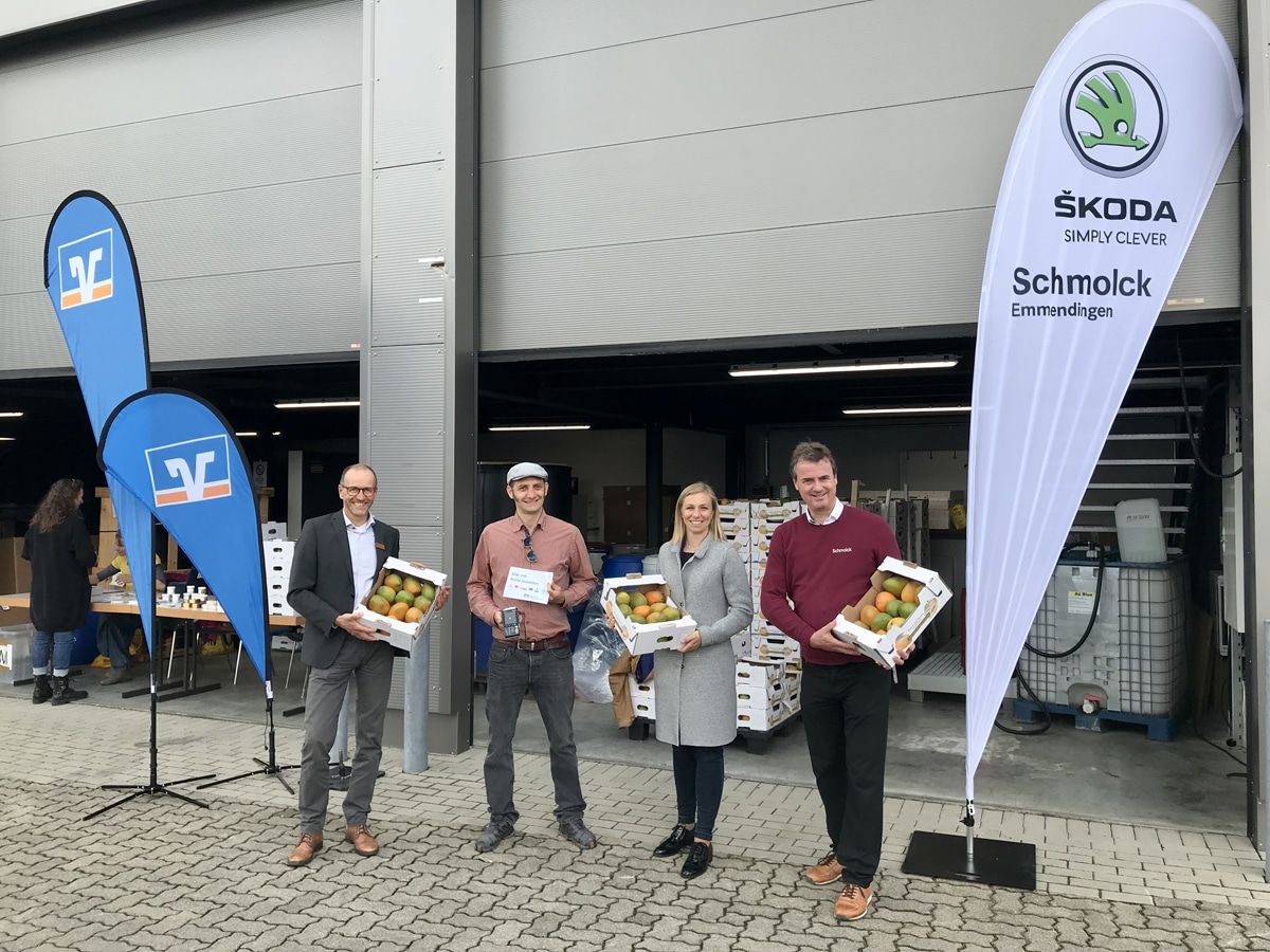 Start der beliebten Mango-Tango-Aktion mit Udo Deutscher, Volksbank Breisgau Nord eG, Michael Bührer, Vorsitzender Movement e.V., Tanja Ringhof, Nachhaltigkeits-Koordinatorin der Volksbank, Bernhard Schmolck, Autohaus Schmolck (Bild v.l.n.r.)