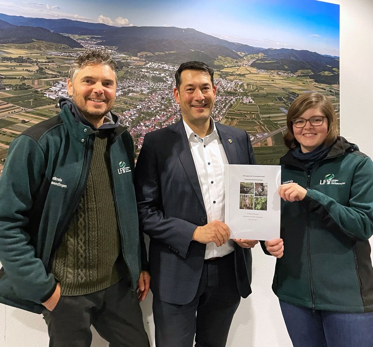 Lisa Gollent, Trainee am Forstamt Emmendingen (rechts) und Förster Bernd Nold (links) überreichen das Ökologische Vorsorgekonzept Gemeindewald Denzlingen an Bürgermeister Markus Hollemann (mitte)