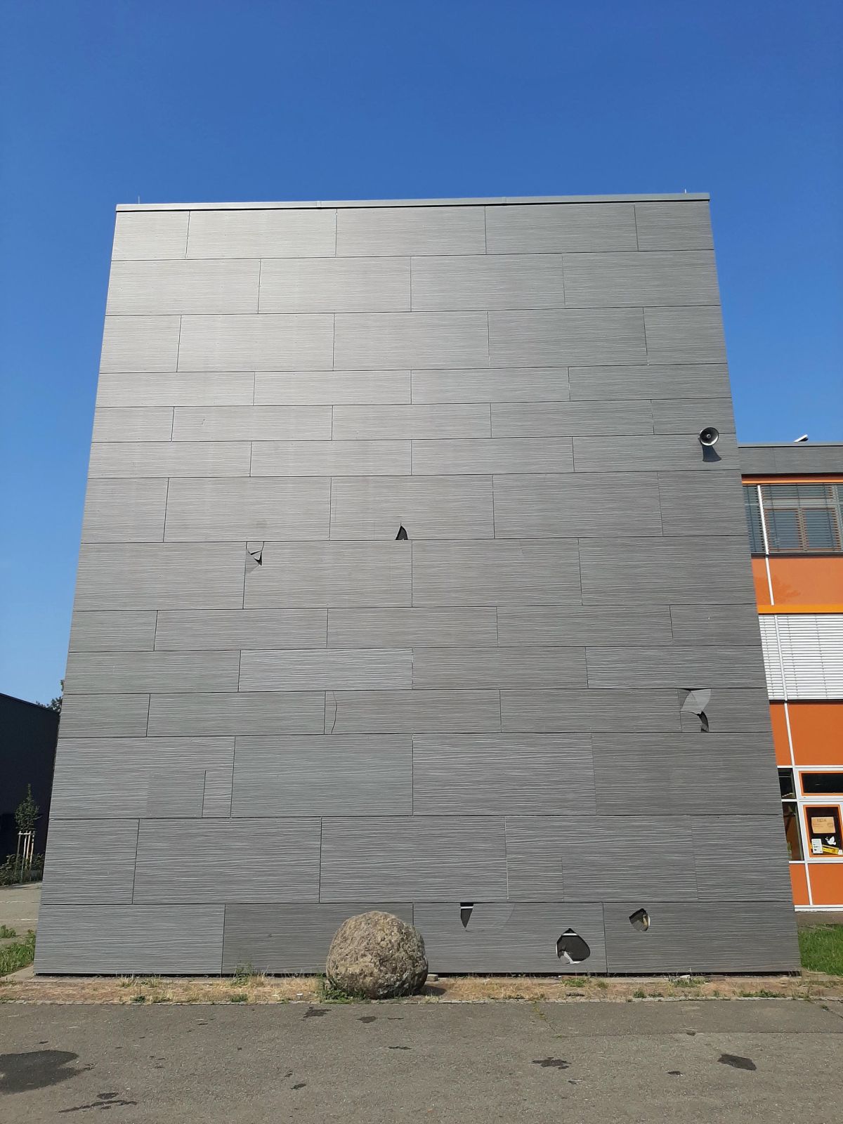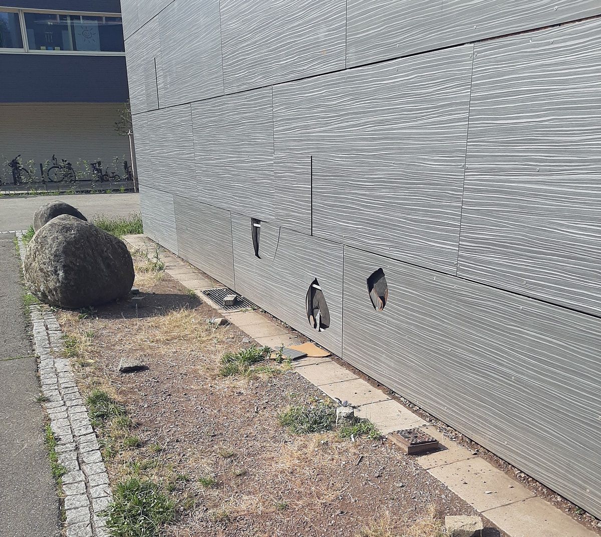 Besonders schwer sind die Schäden an der Fassade der Werkrealschule. Diese wurde mit extra mitgebrachten Steinen zerstört - zusätzlich wurden verschiedene Wurfgeschosse verwendet, um Löcher in die Fassade zu schlagen.