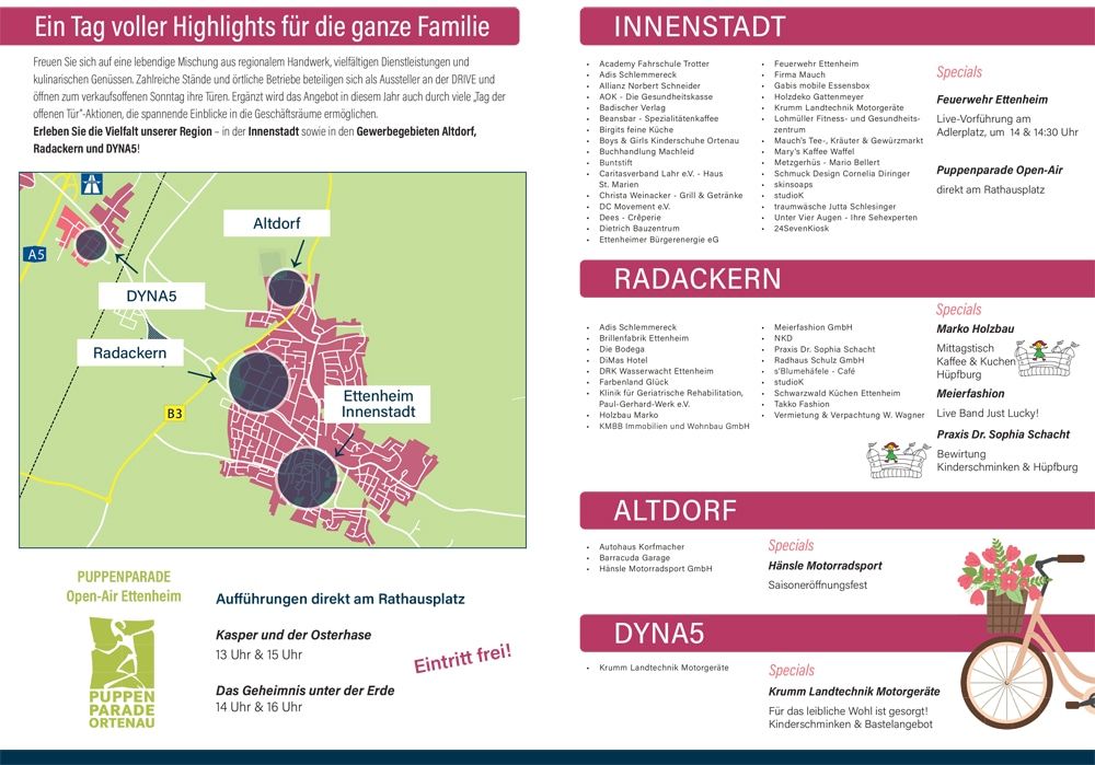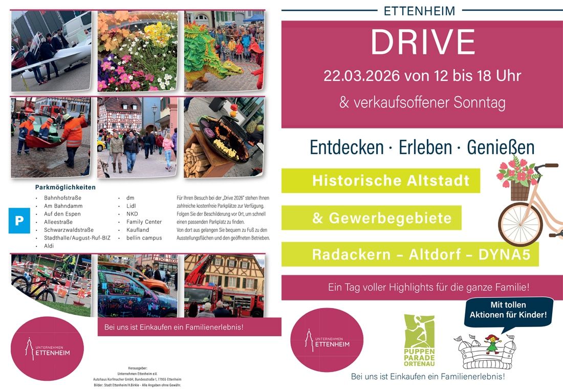 Am Sonntag, 22. März 2026, wird Ettenheim wieder zur großen Erlebnis- und Shopping-Zone: Bei der DRIVE 2026 laden zahlreiche Aussteller und Betriebe in die Innenstadt sowie in die angrenzenden Gewerbegebiete Radackern, Altdorf und DYNA5 zum Entdecken, Erleben und Genießen ein.