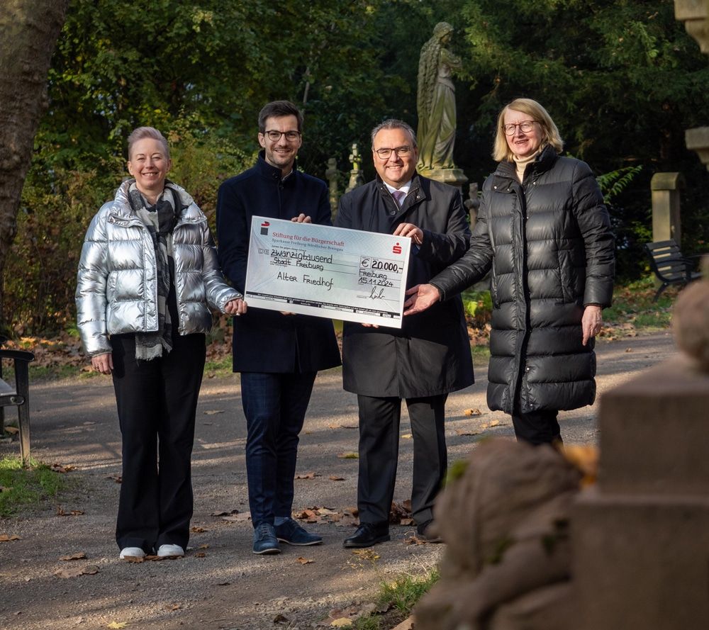 Spende für historische Baukultur: Die Anneliese Müller-Stiftung der Sparkasse Freiburg-Nördlicher Breisgau spendet für die Sanierung von Grabsteinen auf dem Alten Friedhof.