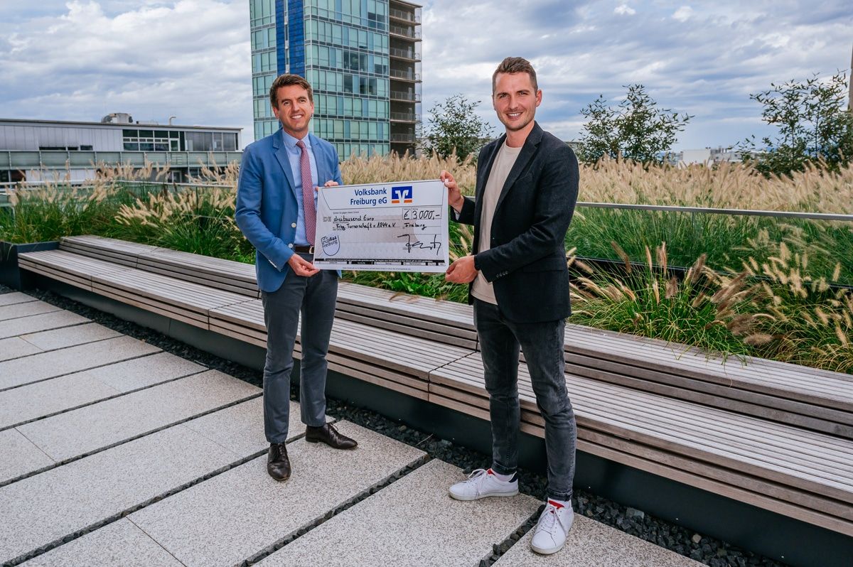 Spendenübergabe: (v.l.n.r.) Alexander Jacobs, Leiter Vorstandsstab der Volksbank Freiburg und Peter Gerspach, Geschäftsführer FT