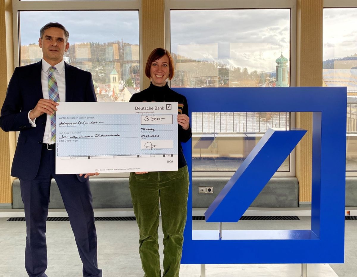 Freiburg, 07.12.2023: Der Verein Wir helfen Kindern e.V. konnte für die vorweihnachtliche „Glücksmomente“-Aktion eine großzügige Spende entgegennehmen. Die Deutsche Bank Freiburg unterstützt den Verein mit 3.500 Euro.
