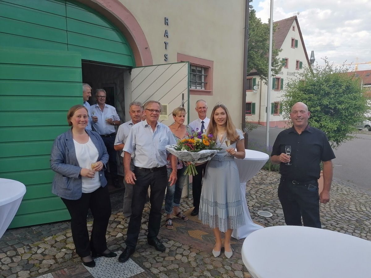 Kaum im Amt und frisch gewählt am heutigen Freitag, 3.juni, wurde die Badische Weinprinzessin Geraldine Liebs in ihrem Heimatort Freiburg-Opfingen zu einem Empfang eingeladen. Dir örtlichen Winzer um Vorstand Günter Linser hatten nur wenige Stunden nach der Wahl bereits am Ratskeller einen herzlichen Glückwunsch parat. Und auch die Ortsvorsteherin Silvia Schumacher war sofort mit ihrem Stellvertreter Erwin Wagner gekommen um eine erste Gratulation des Freiburger Tuniberg-Stadtteils auszusprechen. In fröhlicher Runde wurde das freudige Ereignis am Tuniberg mit Winzern und weiteren Gästen gefeiert.