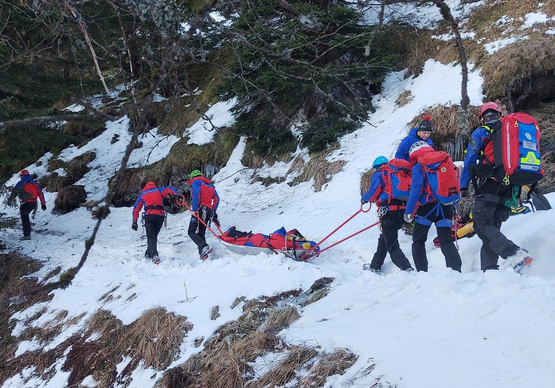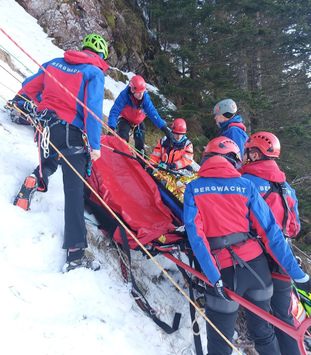 Die Rettung fand in hochalpinem, stark vereistem Gelände statt, das nur mit Steigeisen sicher zugänglich war. Nach kurzer Suche wurde der erste Wanderer gefunden. Ein Ersthelfer seilte sich zur notfallmedizinischen Erstversorgung ab, während weitere Bergretterinnen und Bergretter begannen, Verankerungen vorzubereiten, um die Akias unter Seilsicherung ins steile Gelände abzulassen. Auch der alarmierte Notarzt wurde ins Einsatzgebiet abgeseilt und übernahm die weitere Versorgung des ersten Patienten. Der zweite Wanderer konnte ebenfalls nach kurzer Zeit gefunden werden. Er konnte nur noch tot geborgen werden.