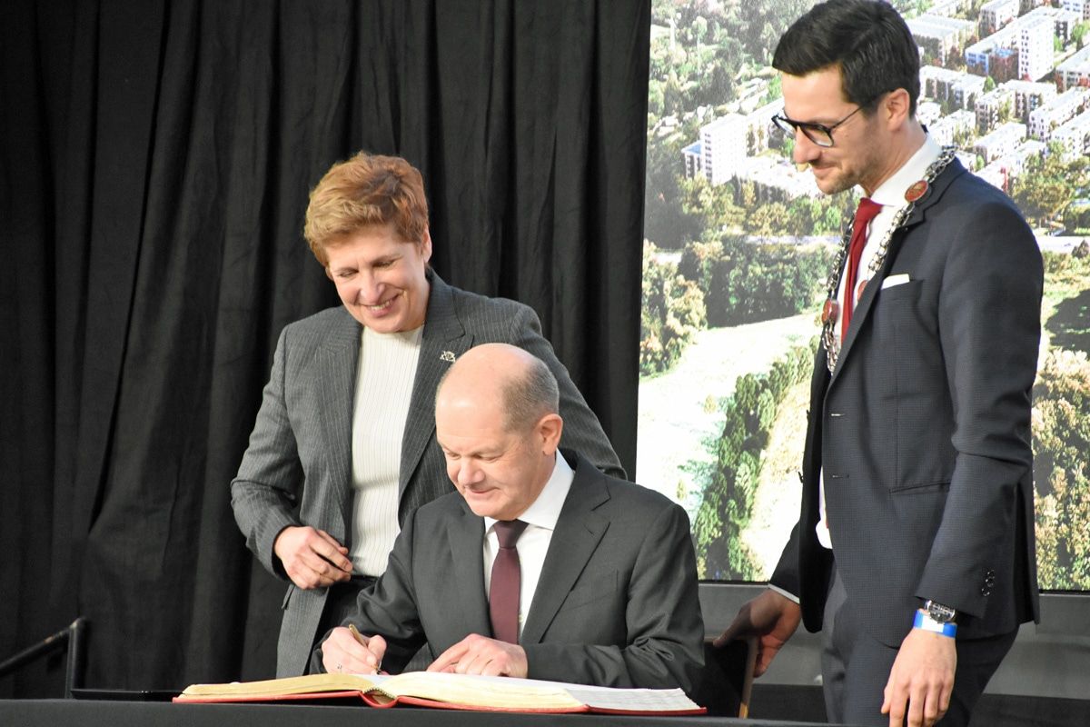 Eintrag in das Goldene Buch: v.l.n.r. Nicole Razavi, Olaf Scholz Martin Horn