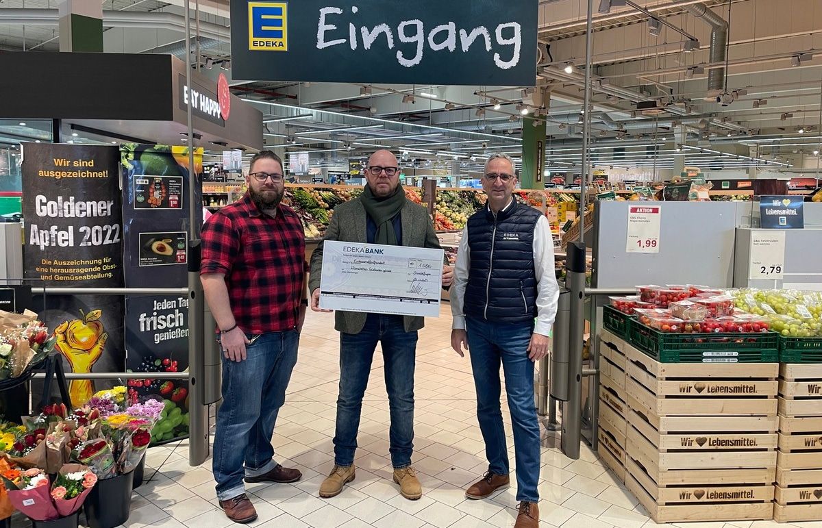 Stefan Rümmele und Torsten Geiler, beide Edeka Südwest, überreichten den symbolischen Spendenscheck an Mario Steffens vom Wünschebus Südbaden. „Unser Wünschebus macht Herzenswünsche wahr und bringt Menschen in ihrer letzten Lebensphase mit fachlicher Betreuung und der erforderlichen medizinischen Ausstattung an ihren Lieblingsort“, sagte Mario Steffens im Rahmen der Scheckübergabe und fügte hinzu: „Der Bus ist speziell für den Transport und die Versorgung Schwerstkranker ausgerüstet und startklar für Menschen aus der Region Südbaden mit einer lebensbegrenzenden Erkrankung, die ohne fachliche Betreuung nicht mehr transportfähig sind.“ Für die Erfüllung ihres letzten Herzenswunsches entstehen den Patient: innen samt Begleitung keinerlei Kosten.