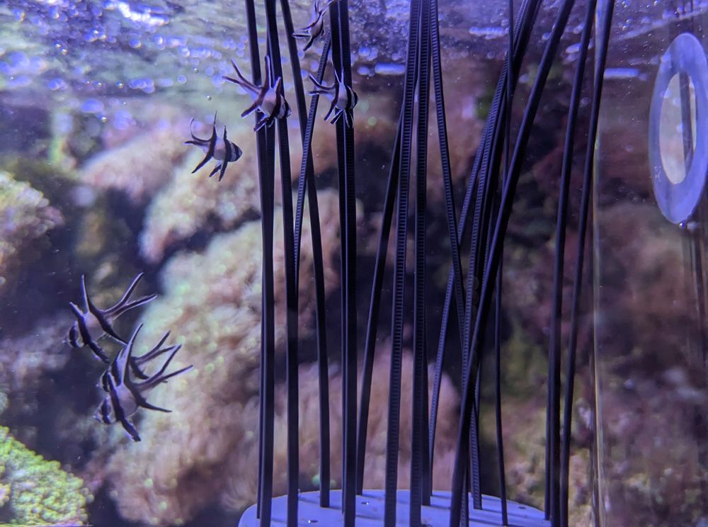 Für die 18 jungen Kauderni auf dem Mundenhof fiel dieser große Tag auf Mittwoch, 19. März. Kaum aus dem Maul des Vaters entlassen, suchten sie wie daheim in Indonesien Schutz zwischen den Stacheln großer Seeigel. Also hat ein Mitglied des Aquarienvereins einen Seeigel „gebaut“, ein etwas abstraktes Imitat aus schwarzen Kabelbindern, das die Jungtiere umgehend und klaglos als Zufluchtsort bezogen haben. Einige von ihnen wurden nun samt dem Seeigel in einem Käfig ins große Salzwasser-Aquarium eingesetzt. Bisher klappt die Vergesellschaftung mit den anderen Fischen gut.
