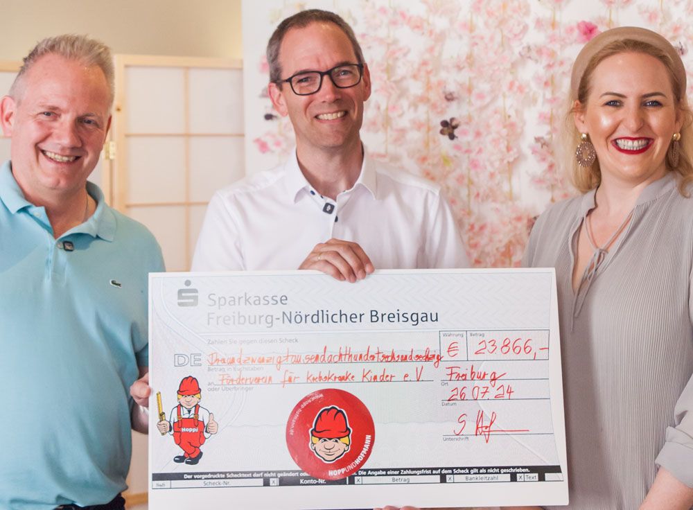 Freiburg, 01. August 2024. Zwischenzeitlich ist es eine gute Tradition, dass die Hopp+Hofmann Schlüsselfertigbau GmbH auf ihrer jährlichen Firmenfeier die Gäste bittet, auf Geschenke zu verzichten und stattdessen an den Förderverein für krebskranke Kinder e.V. zu spenden.