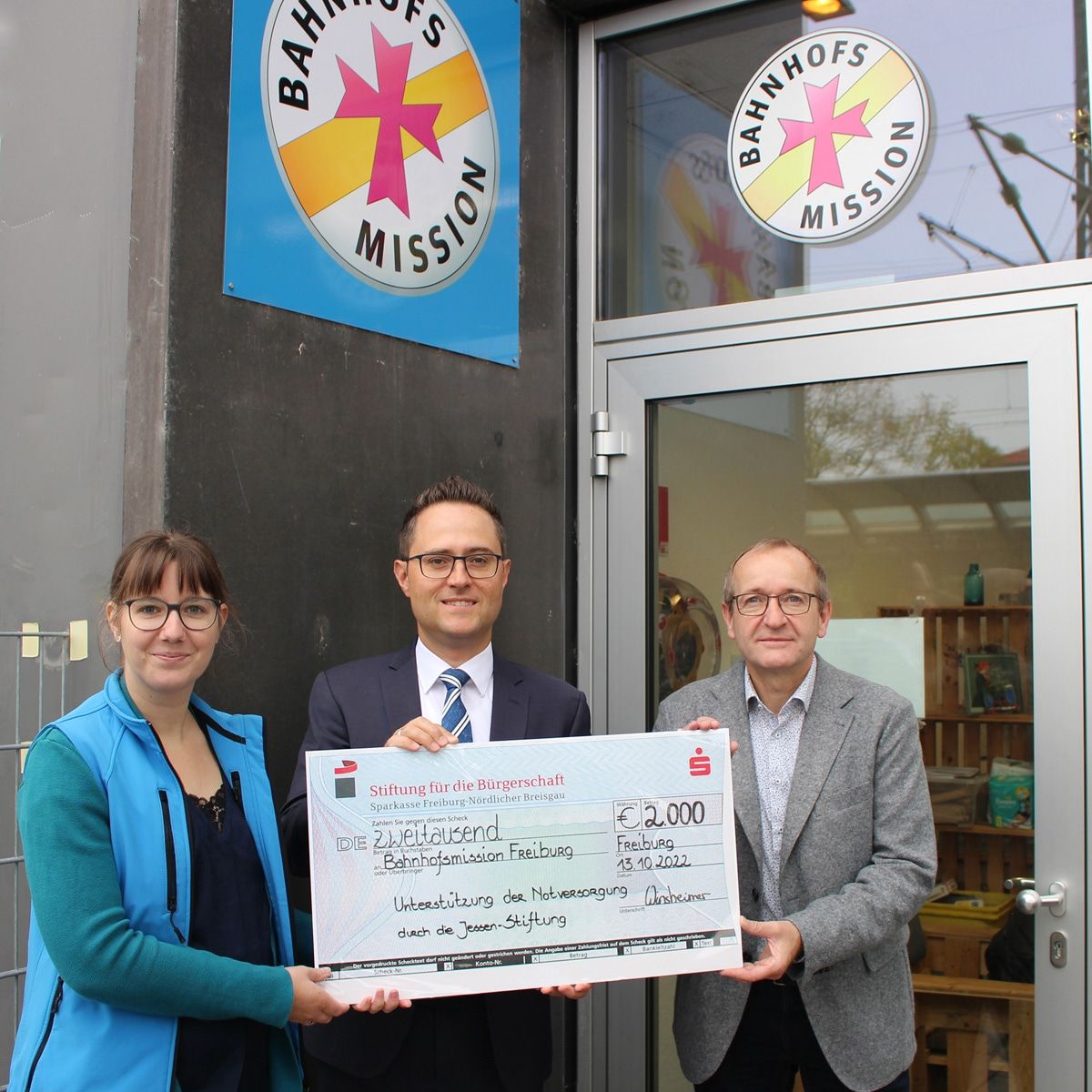 Die Jessen Stiftung unterstützt die Bahnhofsmission Freiburg mit einer Spende in Höhe von 2.000 Euro. Den Spendenscheck nahmen am Donnerstag, 13. Oktober die evangelische Leiterin der Bahnhofsmission, Natalie Brenner, zusammen mit dem Vorstand Diakonische Theologie der Evangelischen Stadtmission Freiburg e.V., Norbert Aufrecht, aus den Händen von Marc Winsheimer, Geschäftsführer der Sparkassen-Stiftungen, entgegen.