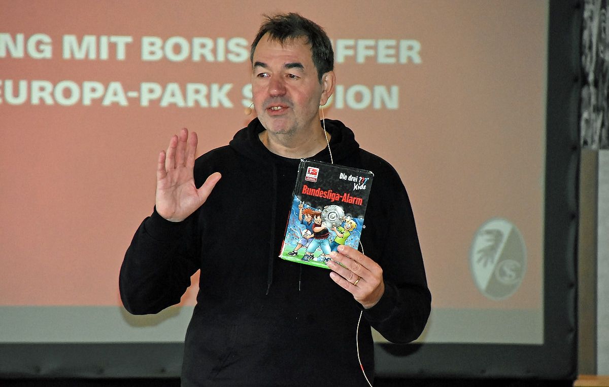 Im Rahmen des 29."Lirum Larum-Lesefestes" der Stadt Freiburg war der Kinderbuchautor Boris Pfeiffer zu Gast im Europa-Park Stadion in Freiburg. Die Bücher von Boris Pfeiffer findet man in fast allen Kinderzimmern und nun hatten 200 Kinder aus neun Freiburger Grundschulen die Gelegenheit den Lesungen aus seinem Buch "Die drei??? Kids – Team Bundesliga "zu lauschen. Der symphytische Autor hat schon zahlreiche "Drei??? Kids" Bücher und einige Jugendromane geschrieben.