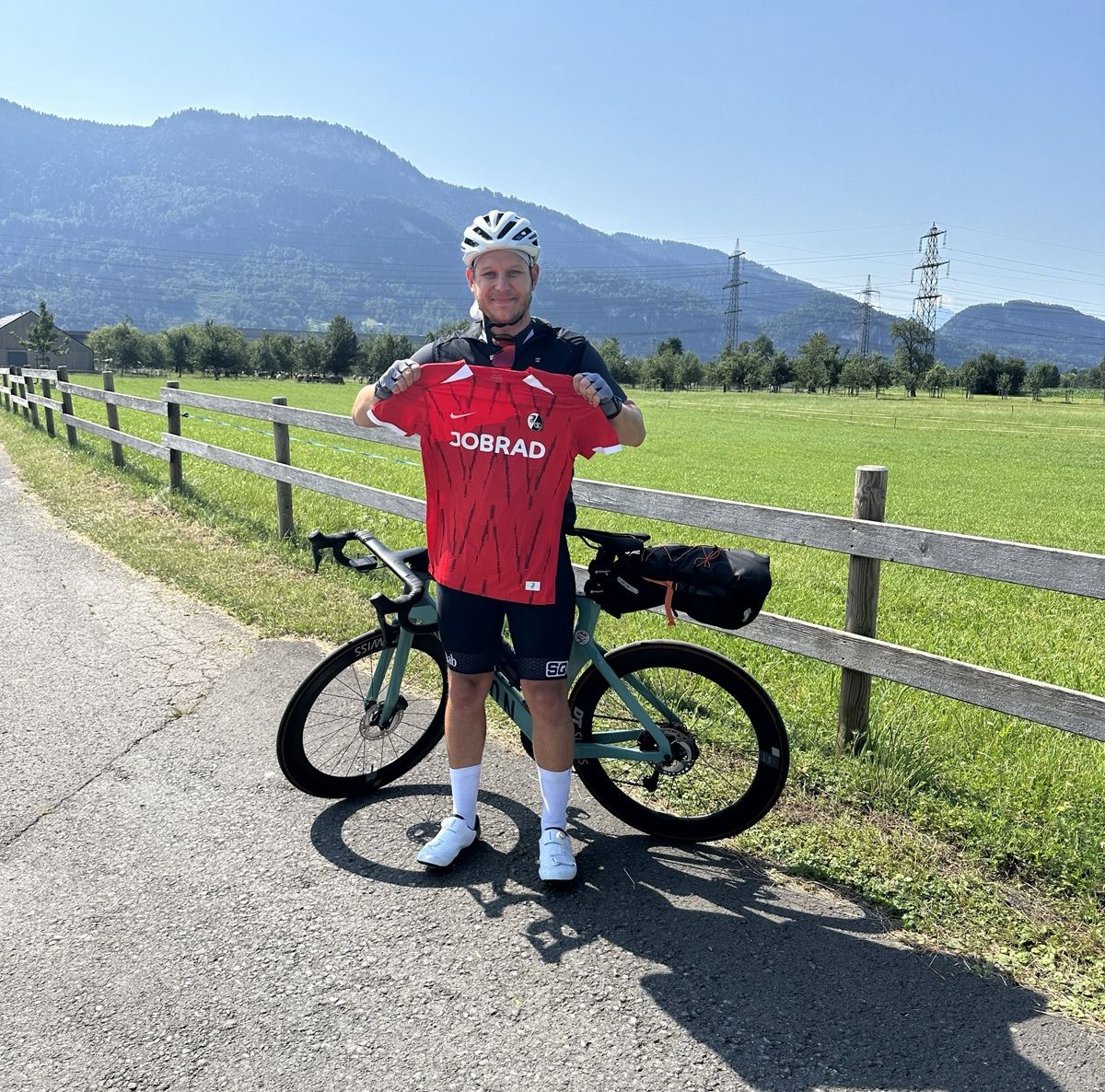 Am Donnerstagnachmittag wird der letzte JobRad-Kurier die neuen Trikots an die SC-Profis überreichen. Sie trainieren seit Mittwoch im 250 Kilometer entfernten Schruns. 1.000 Menschen täglich neu aufs Rad zu bringen, ist für JobRad Routine. Hunderte Kilometer ohne E-Antrieb mit dem Rad zu fahren, um Trikots auszuliefern – das ist auch für JobRad nicht alltäglich, aber dennoch selbstverständlich für Social-Media-Redakteur Marius Frey. Unterwegs nach Österreich hat er sich am Donnerstagmorgen live zum Start der anderen Kuriere auf den JobRad Campus zugeschaltet: „Als begeisterter SC-Fan versuche ich, seit ich klein bin, kein Spiel zu verpassen. Dafür ist mir auch kein Auswärtsspiel zu weit. Die neuen Trikots mit dem Rad zu den SC-Profis zu bringen, ist für mich daher Ehrensache und ein großes Vergnügen. Vielen Dank an JobRad, dass ich als Mitarbeiter diesen Job auf dem Rad übernehmen darf!“