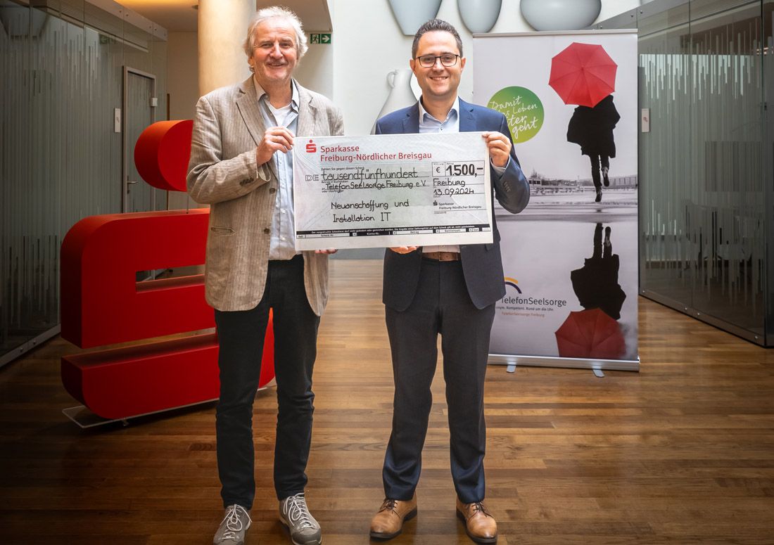 Helmut Ellensohn, Leiter der Telefonseelsorge Freiburg nimmt den symbolischen Spendenscheck über 1.500 Euro aus den Händen von Marc Winsheimer entgegen, Leiter Gesellschaftliches Engagement der Sparkasse Freiburg-Nördlicher Breisgau.
