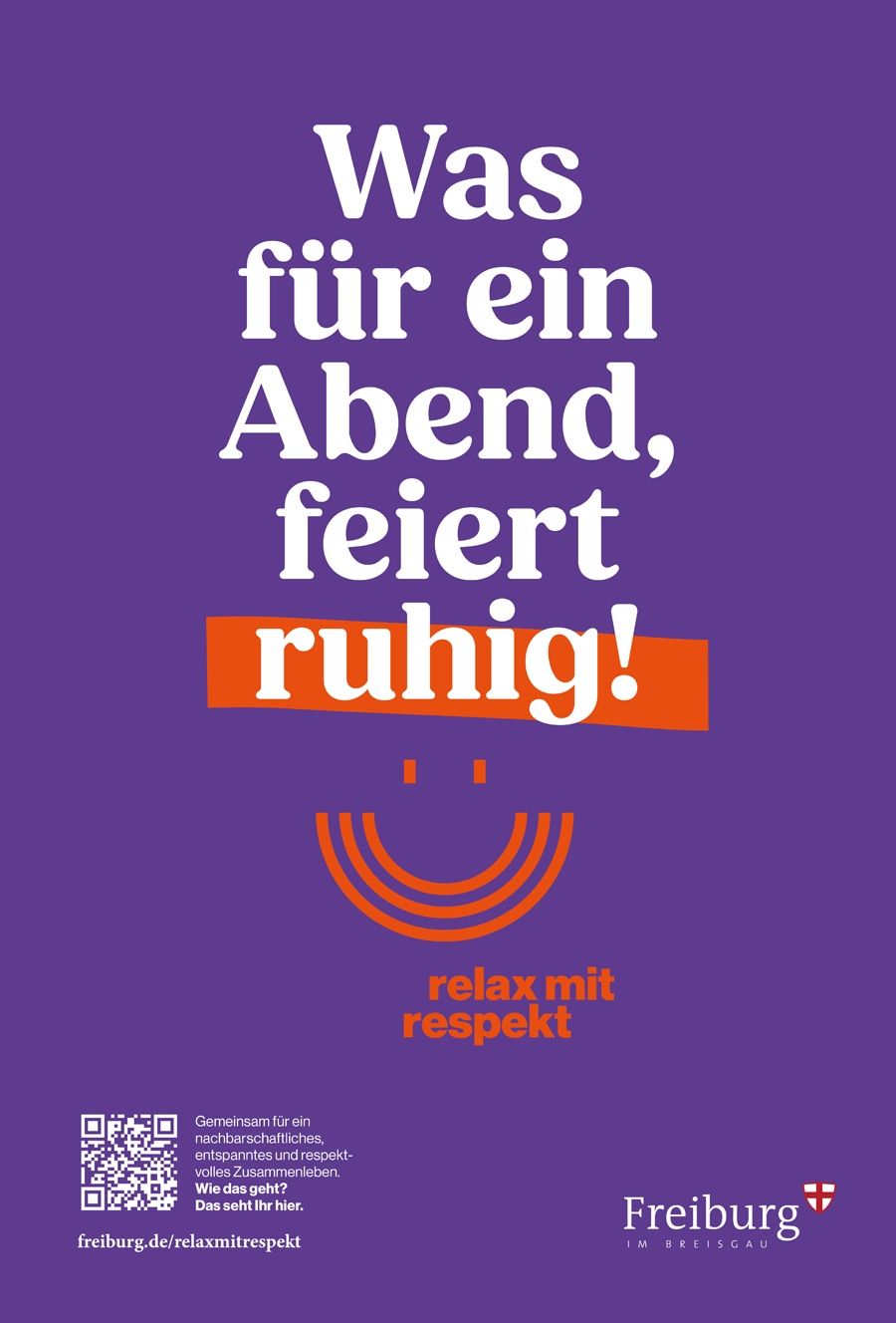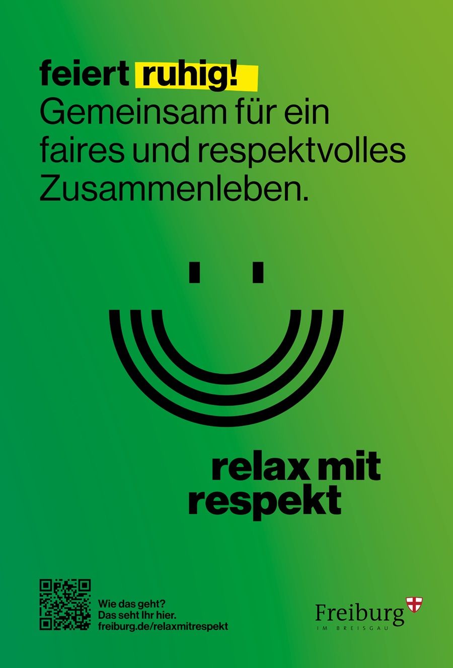 Ein großer Smiley auf Grün und Lila: Die Plakate der Kampagne stechen ins Auge und sind ab Juni an den VAG-Haltestellen, in Straßenbahnen, Bussen, auf Litfaßsäulen und im Rathaus im Stühlinger zu finden. Die zwei verschiedenen Motive sollen ganz nach dem abgedruckten Spruch zu einem fairen und respektvollen Zusammenleben anregen, in dem (ruhig) gefeiert werden kann. Wer den abgedruckten QR-Code scannt, bekommt einen Flyer mit fünf Informationen und Regeln zur Musik, zur Nachtruhe, zum Wildpinkeln und zu Müll und Grillen angezeigt. Der Flyer ist abrufbar unter freiburg.de/relaxmitrespekt/relaxmitrespekt.pdf.