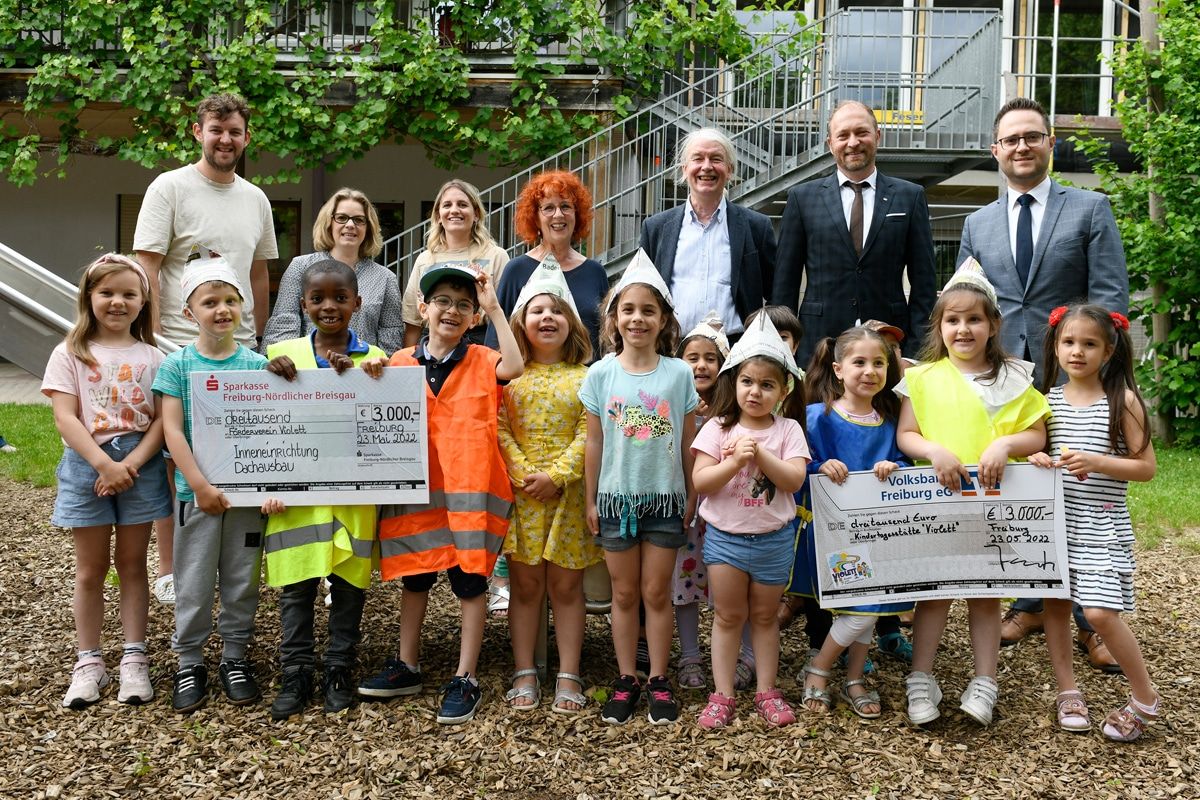 Spendenübergabe beim Richtfest (hinten von rechts): Marc Winsheimer, Leiter Gesellschaftliches Engagement Sparkasse Freiburg – Nördlicher Breisgau; Thorsten Fräßle, Regionalleiter Privatkunden Volksbank Freiburg; Gerhard Frey, Förderverein Kita Violett; Christine Hartmann, Leiterin Kita Violett sowie Erzieherinnen und Erzieher