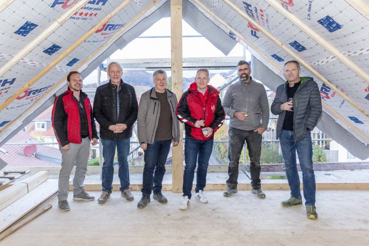 Richtfest Altvogtshof 9293: v.l.n.r. Bauleiter Nico Bonadio von Hopp+Hofmann, Georg Berk, Vorstand der Bürgergenossenschaft Heuweiler, Architekt Matthias Krieg, Stefan Hofmann, Geschäftsführer Hopp+Hofmann, Simeon Maas von der Zimmerei Simeon Maas sowie Andreas Zimmermann von Zimmermann Ingenieure.