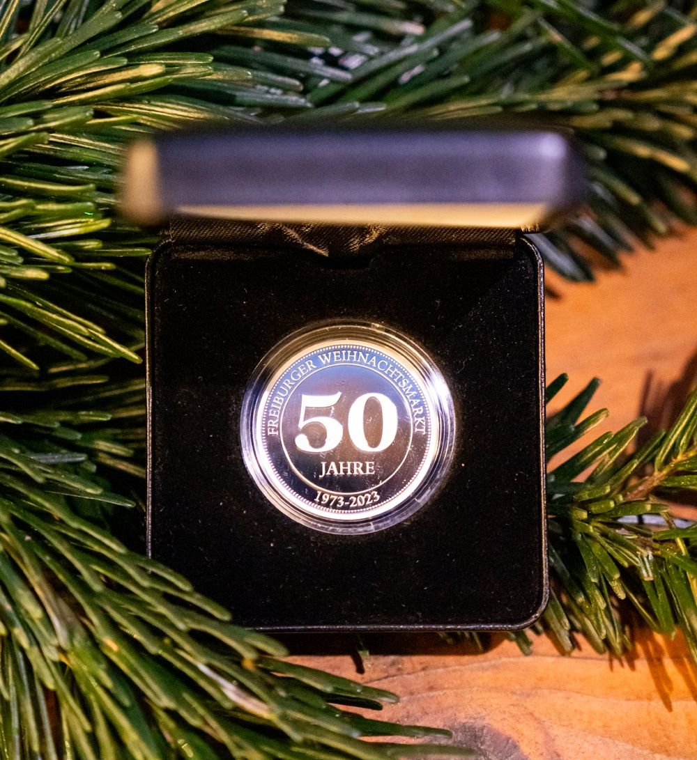 Für die 50. Ausgabe des Weihnachtsmarktes wurden verschiedene Jubiläumsprodukte angeboten, deren Erlös für soziale Zwecke gespendet wird. Auf dem Weihnachtsmarkt angeboten wurden ein Sonderheft, das auf ca. 40 Seiten die Geschichte des Freiburger Weihnachtsmarktes von den Anfängen bis heute in Bildern darstellt, eine Silbermünzedition mit Sonderprägung sowie Jubiläums-Weihnachtsmarktgläser. So konnte die FWTM gemeinsam mit den Beschicker_innen des Weihnachtsmarktes insgesamt an fünf Freiburger Vereine – Region der Lebensretter Freiburg e.V., Jugendberatung Freiburg e.V., Förderverein Essenstreff e.V. und Förderverein Frauen in Not e.V. – jeweils 8.343,15 Euro spenden. Der Spendenbescheid wurde am Freitag, 15. Dezember 2023 von Erstem Bürgermeister Ulrich von Kirchbach und FWTM-Geschäftsführerin Hanna Böhme an die Vereine übergeben.
