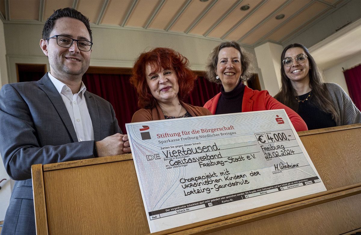 (Bild 1, v.l.n.r.) Marc Winsheimer, Leiter des Gesellschaftliches Engagements der Sparkasse Freiburg-Nördlicher Breisgau sowie Geschäftsführer der Sparkassen-Stiftungen, Fundraiserin Silke Marzluff vom Caritas-Verband, Schulsozialarbeiterin Stephanie Ehinger, Chorleiterin Tanja Averkovych.