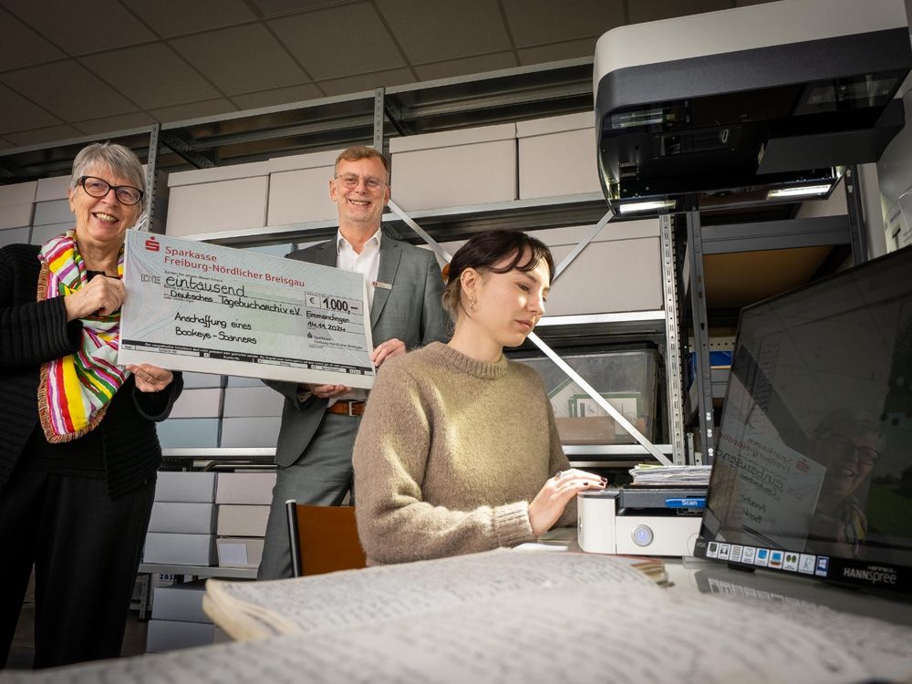 Mit einer Spende von 1.000 Euro unterstützt die Sparkasse Freiburg-Nördlicher Breisgau das Deutsche Tagebucharchiv in Emmendingen beim Erwerb eines neuen „Bookeye 5 Scanners“. Dieses Gerät hilft dem Archiv, seine wertvolle Sammlung autobiografischer Zeugnisse noch effizienter zu digitalisieren und damit für Wissenschaft und Öffentlichkeit zugänglich zu machen.