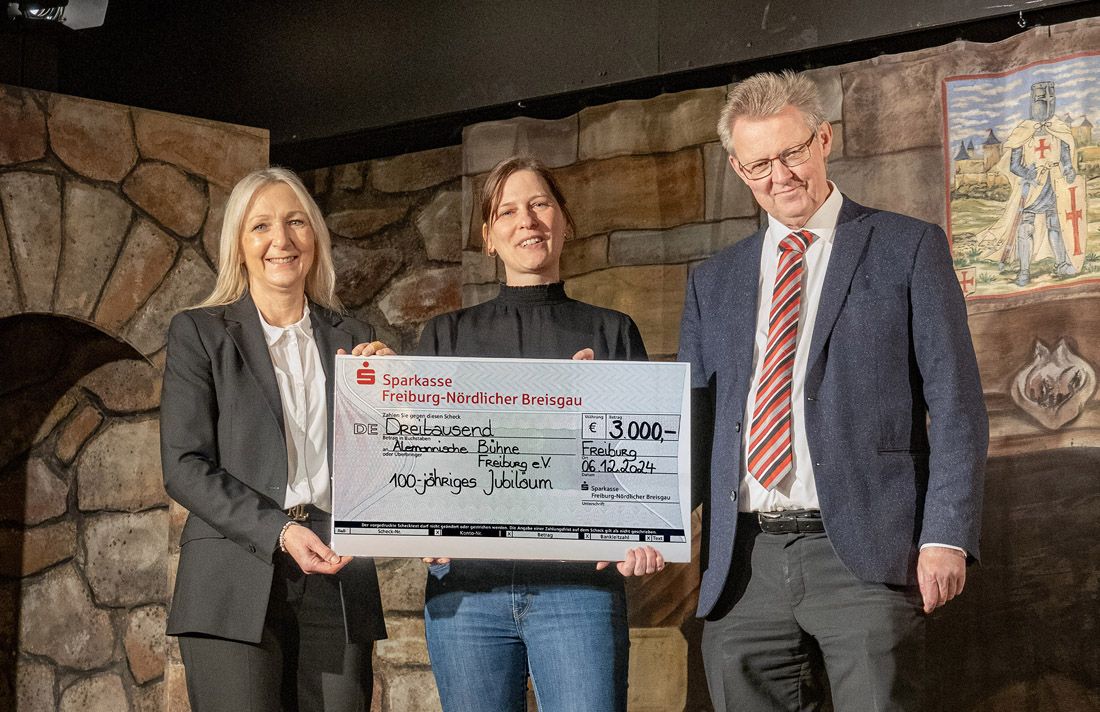 „Die Alemannische Bühne ist ein wichtiger Teil der Freiburger Kulturszene und leistet mit ihrem Mundarttheater einen wertvollen Beitrag zur Pflege der alemannischen Sprache. Wir freuen uns, das 100-jährige Bestehen dieses Vereins unterstützen zu können,“ betonte Beate Schwarz bei der Übergabe.