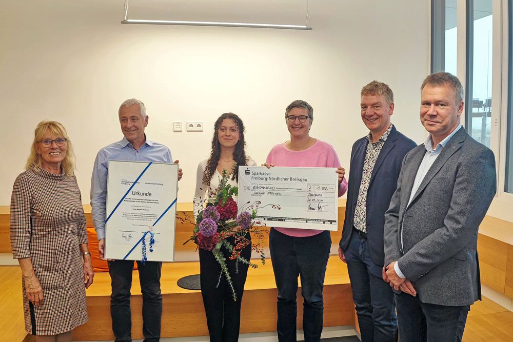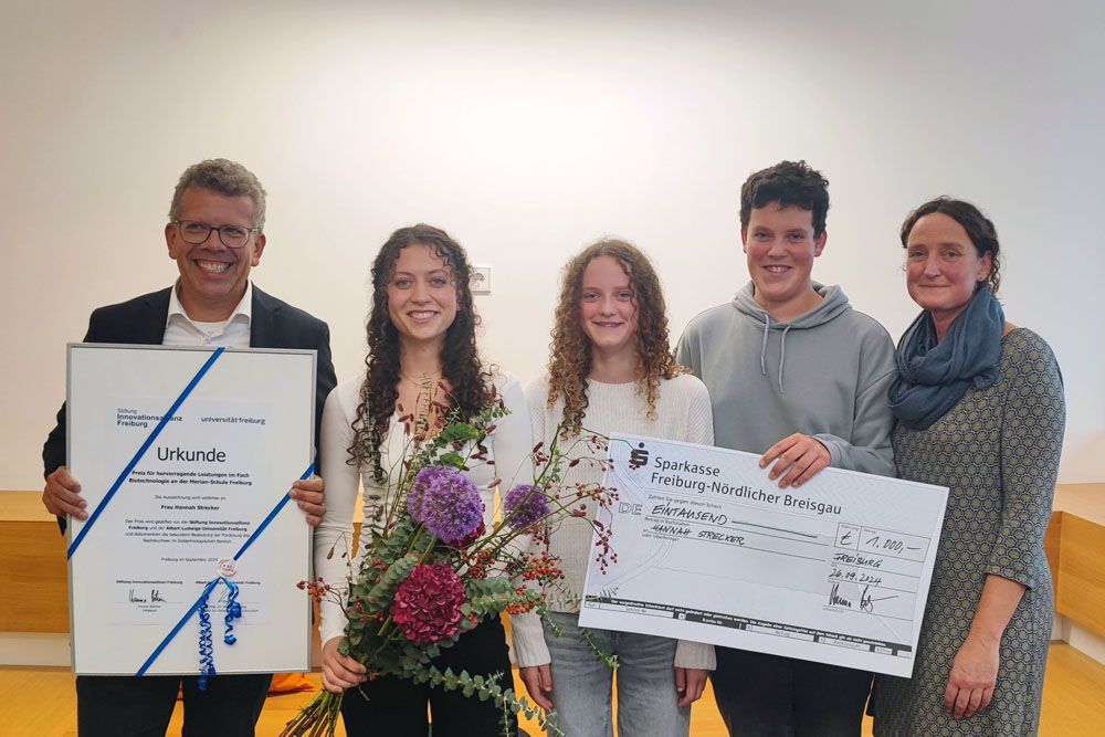 Anna Sander (Fachlehrerin Merian Schule), Prof. Dr. Stefan Rensing (Prorektor für Forschung und Innovation Universität Freiburg), Hannah Strecker (Preisträgerin), Hanna Böhme (Stiftungsvorständin Innovationsallianz), Markus Henkes (Schulleiter Merian-Schule Freiburg), PD Dr. Ralf Meyer (Fachabteilungsleiter Berufliche Gymnasien, Merian-Schule)
