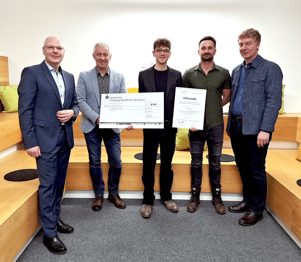 Dr. Ralf P. Meyer (Fachabteilungsleiter Berufliche Gymnasien und Berufskolleg BTA Merian-Schule), Prorektor Prof. Dr. Stefan Rensing (Prorektor Universität Freiburg), Preisträger Lukas Diessner gemeinsam mit seinem Vater, Markus Henkes (Schulleiter Merian-Schule Freiburg),