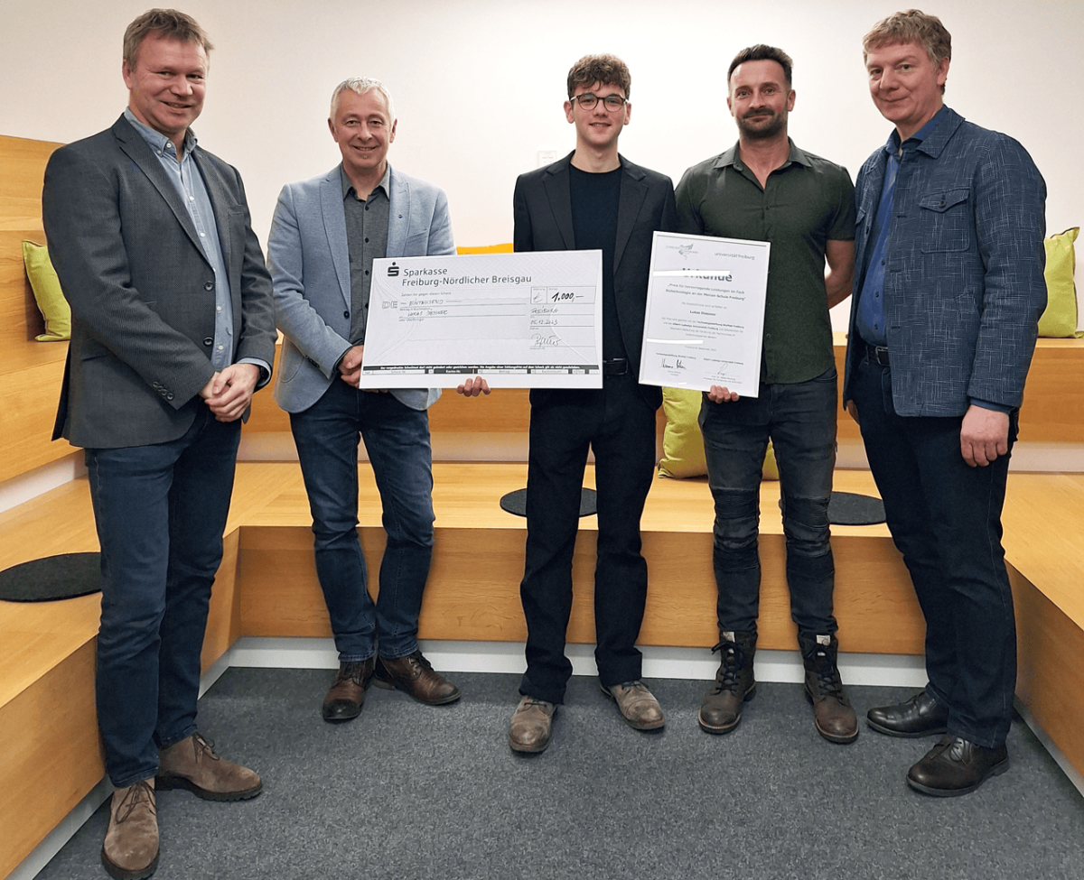 Dr. Michael Richter (Stellv. Vorstand Technologiestiftung BioMed Freiburg), Prorektor Prof. Dr. Stefan Rensing (Prorektor Universität Freiburg), Preisträger Lukas Diessner gemeinsam mit seinem Vater, Markus Henkes (Schulleiter Merian-Schule Freiburg)