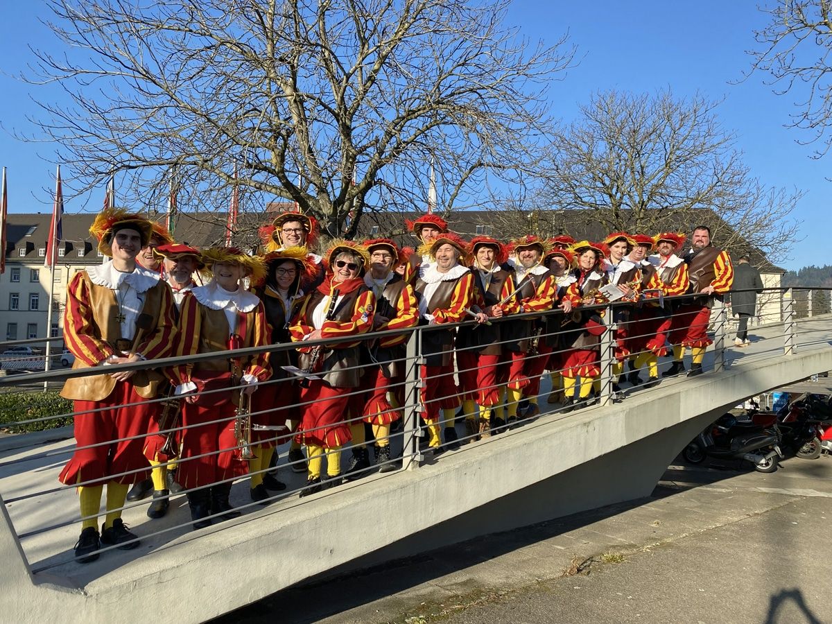Schön, wieder in großen Gruppen die Fasnacht zu erleben, sich wieder dem närrischen Trubel hinzugeben. Für die Teilnehmer unserer Stadt hatten die Rhiischnooge die Organisation übernommen und die Musiker der Spielgemeinschaft sind gemeinsam mit vielen Neuenburger Cliquen nach Freiburg gefahren. In den gelb/roten historischen Uniformen war das Orchester ein markanter Punkt im Umzugsgeschehen. Das Musikprogramm, das Dirigent Georg Günther extra für diesen Fasnachtsumzug zusammengestellt hat, hat den Kern des närrischen Treibens getroffen und begleitete den Marsch aller Fasnächtler. Laut, bunt, fröhlich, schräg und närrisch - so wie es König Karneval vorschreibt - zog der markante Festtags-Lindwurm durch Freiburgs gute Stube - unser Orchester war nicht zu übersehen und nicht zu überhören! Gut so!