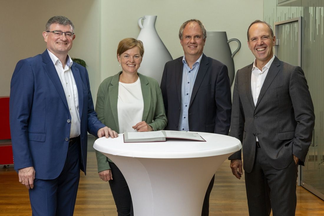 Partnerschaft besiegelt! V.l.n.r. Armin Becherer, Leiter Unternehmenskunden der Sparkasse, traf sich mit Franziska Potthast, Kommunikation und, Dr. Fabian Burggraf, Geschäftsführer der Klimapartner Südbaden e.V., sowie Markus Hildmann, stellvertretendes Vorstandsmitglied zur Vertragsunterzeichnung im Sparkassen FinanzZentrum.